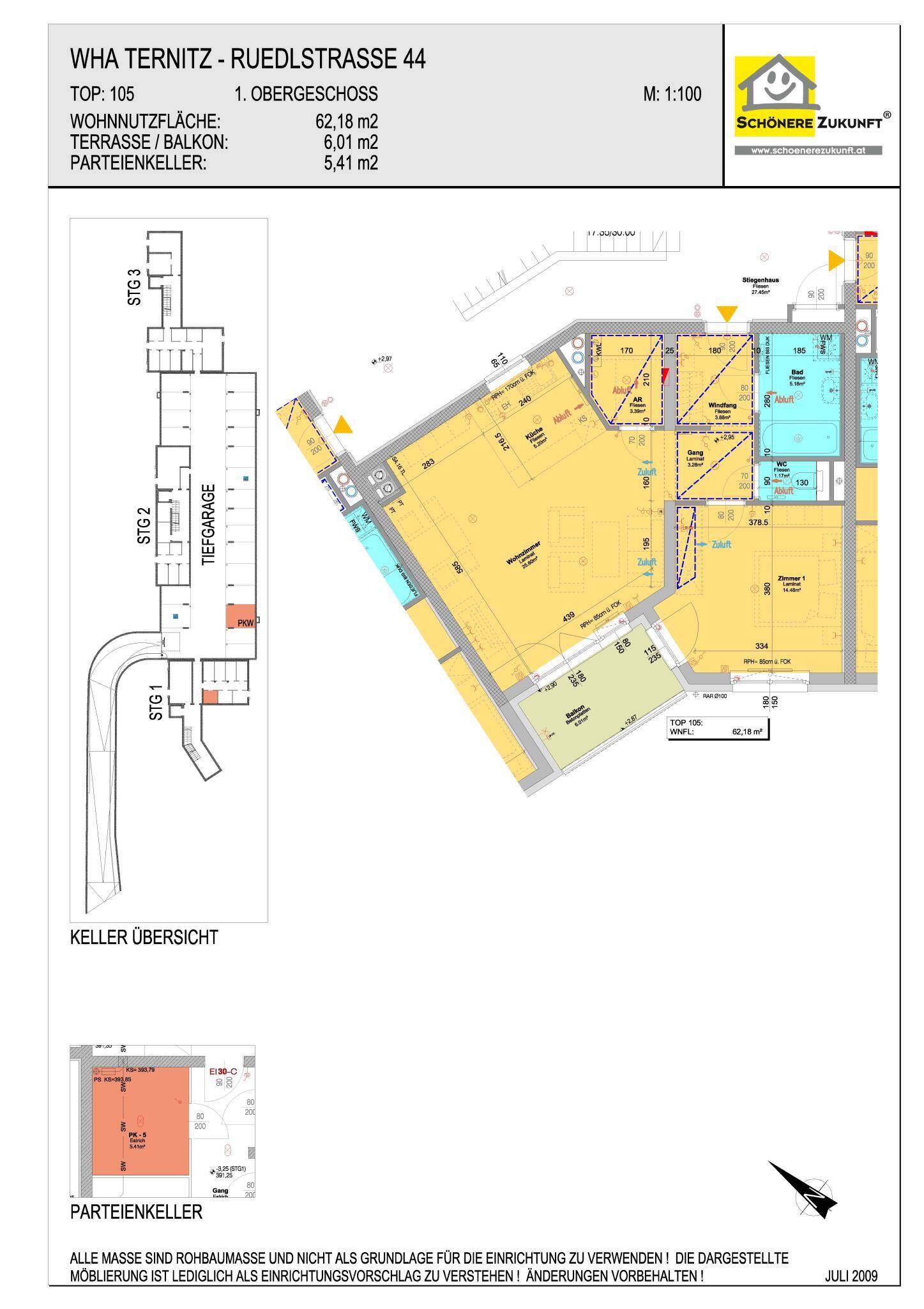 Die 2-Zimmerwohnung befindet sich im ersten Obergeschoss und ist über einen Lift erreichbar.Sie hat eine Wohnfläche von 62,36 m² und verfügt über einen 6 m² großen, südlich ausgerichteten Balkon.Jede Wohnung verfügt über ein Kellerabteil im Kellergeschoss und einen Tiefgaragenstellplatz.Ein Kinderwagen- und Fahrradraum sowie ein Wasch- und Trockenraum stehen allen Mietern zur freien Verfügung.