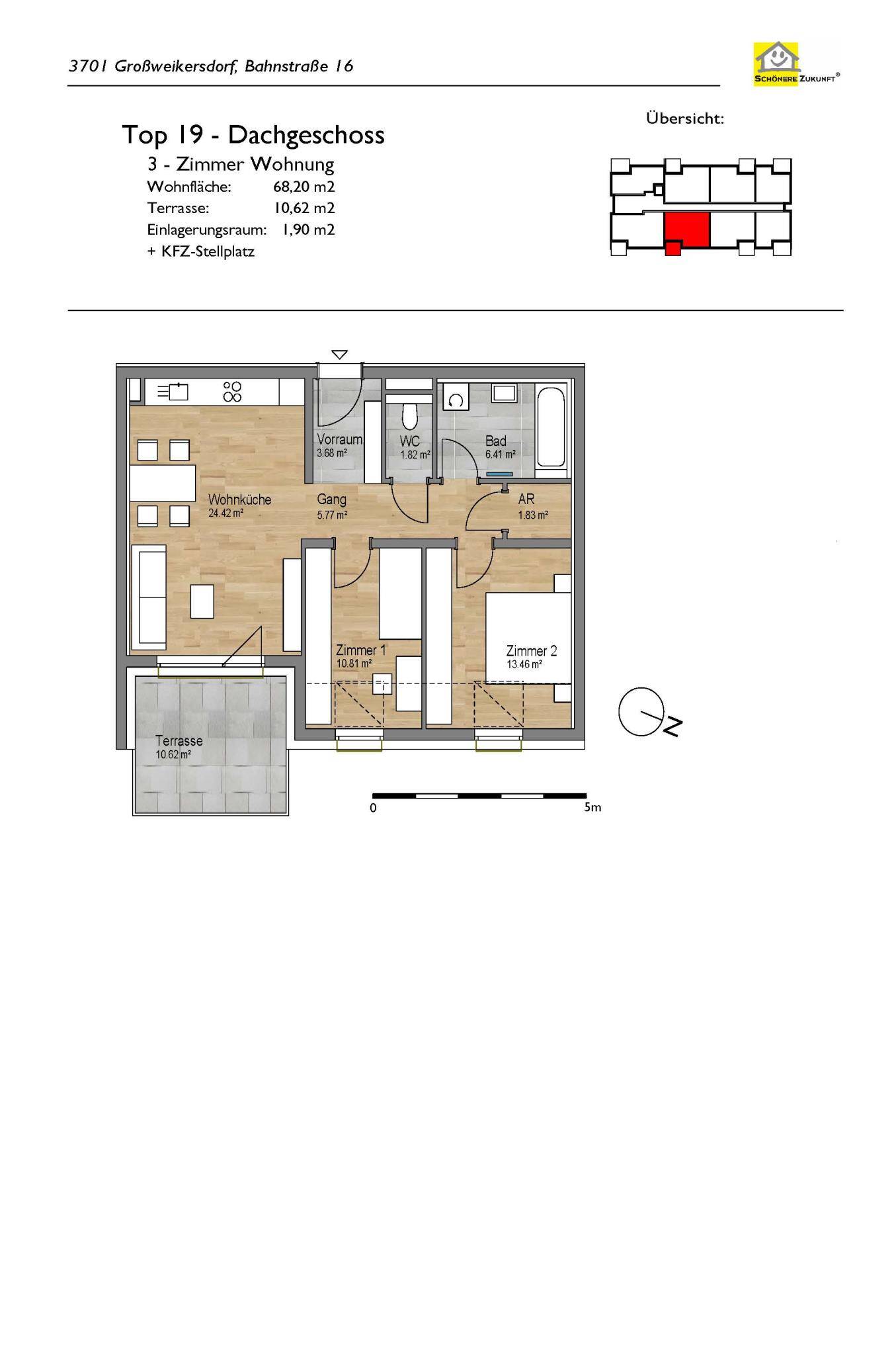 Die Wohnung befindet sich im Dachgeschoss und ist bequem über einen Lift erreichbar. Sie verfügt über 3 Zimmer und eine Wohnfläche von 68,20 m². Sie verfügt über eine großzügige Terrasse mit 10,62 m² in südöstlicher Ausrichtung. Der Wohnung sind ein KFZ-Stellplatz und ein Einlagerungsraum zugeordnet. Kinderwagen- und Fahrradabstellplätze stehen allen Mietern zur Verfügung.