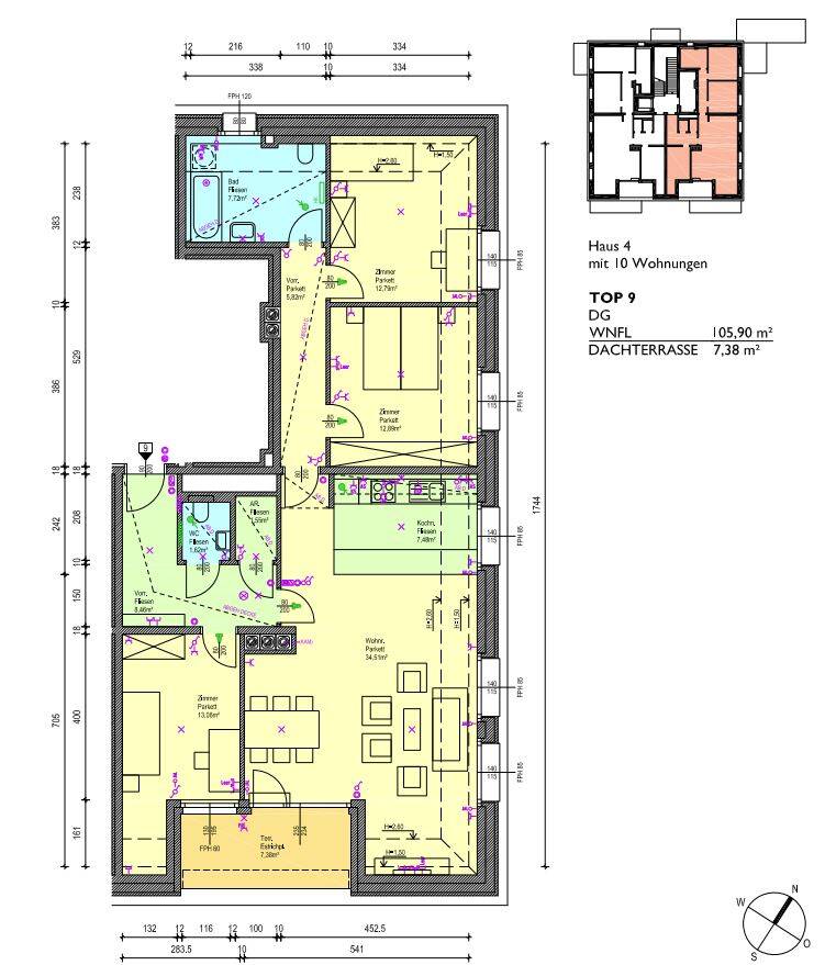 Die ca. 106 m² große 4-Zimmerwohnung befindet sich im Dachgeschoss der Stiege 4.Sie verfügt über eine 7,38 m² große, süd-ost-seitige Terrasse.Der Wohnung ist ein Kellerabteil sowie ein KFZ-Stellplatz zugeteilt.