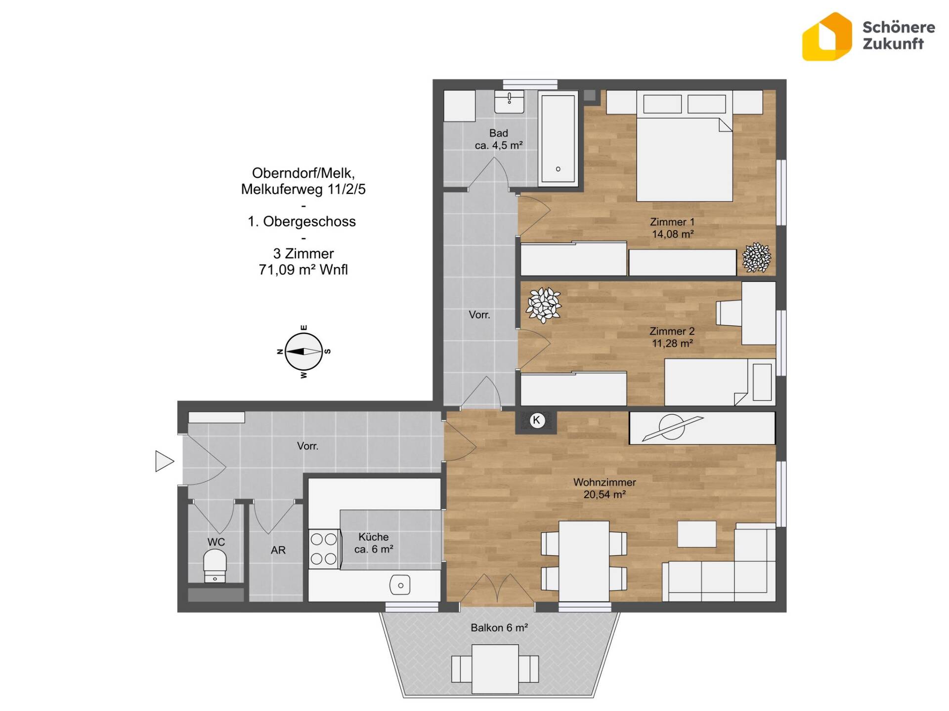 Die Wohnanlage in Oberndorf/Melk umfasst 6 Wohnungen (2-4 Zimmer, 51-74 m²), jede mit Balkon, Keller und einem zugeordneten Garagenplatz.