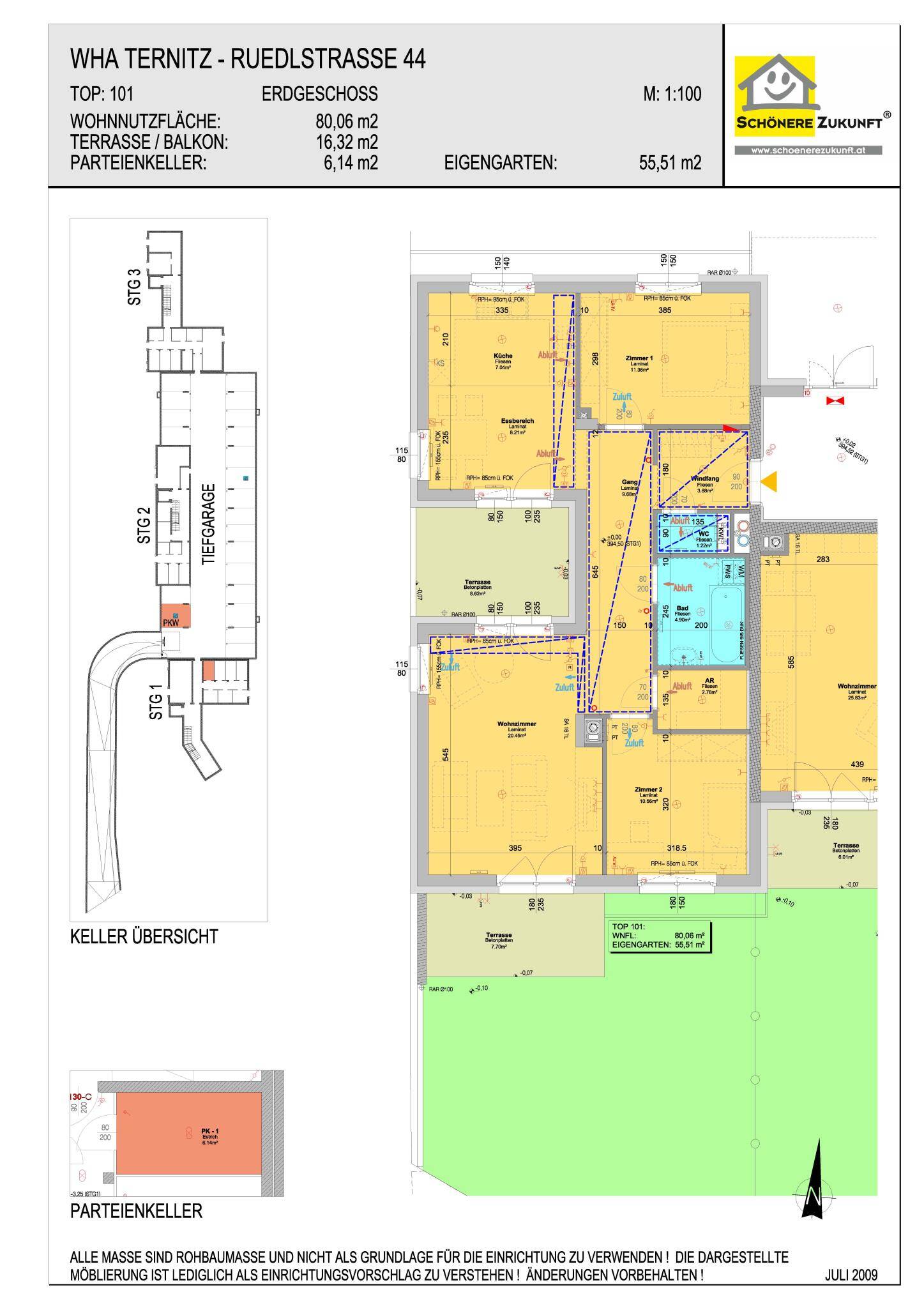 Die Wohnanlage besteht aus drei Baukörpern mit jeweils zwei Vollgeschossen und einem zurückgesetzten, penthouseartigen 2. Obergeschoss. Jede Wohnung bietet einen direkten Zugang zwischen Wohnbereich und dem eigenen Garagenplatz, wodurch ein Höchstmaß an Komfort und Praktikabilität gewährleistet wird. Im Erdgeschoss verfügen die Wohnungen über Wohnflächen zwischen ca. 55 und 90 m² und sind mit einer Terrasse sowie einem Eigengarten ausgestattet. Die Wohnungen im 1. Obergeschoss bieten ebenfalls 55 bis 90 m² Wohnfläche und überzeugen mit großzügigen Balkonen. Das 2. Obergeschoss beherbergt exklusive Wohnungen mit etwa 100 m², die alle über eine private Dachterrasse verfügen. Jede Wohneinheit ist zudem mit einem Kellerabteil und einem Tiefgaragenplatz ausgestattet. Ergänzend stehen den Bewohnern ein Fahrradabstellraum je Stiege im Erdgeschoss, ein zentraler Müllraum neben der Tiefgarageneinfahrt sowie drei gemeinschaftlich nutzbare Trockenräume im Kellergeschoss zur Verfügung.