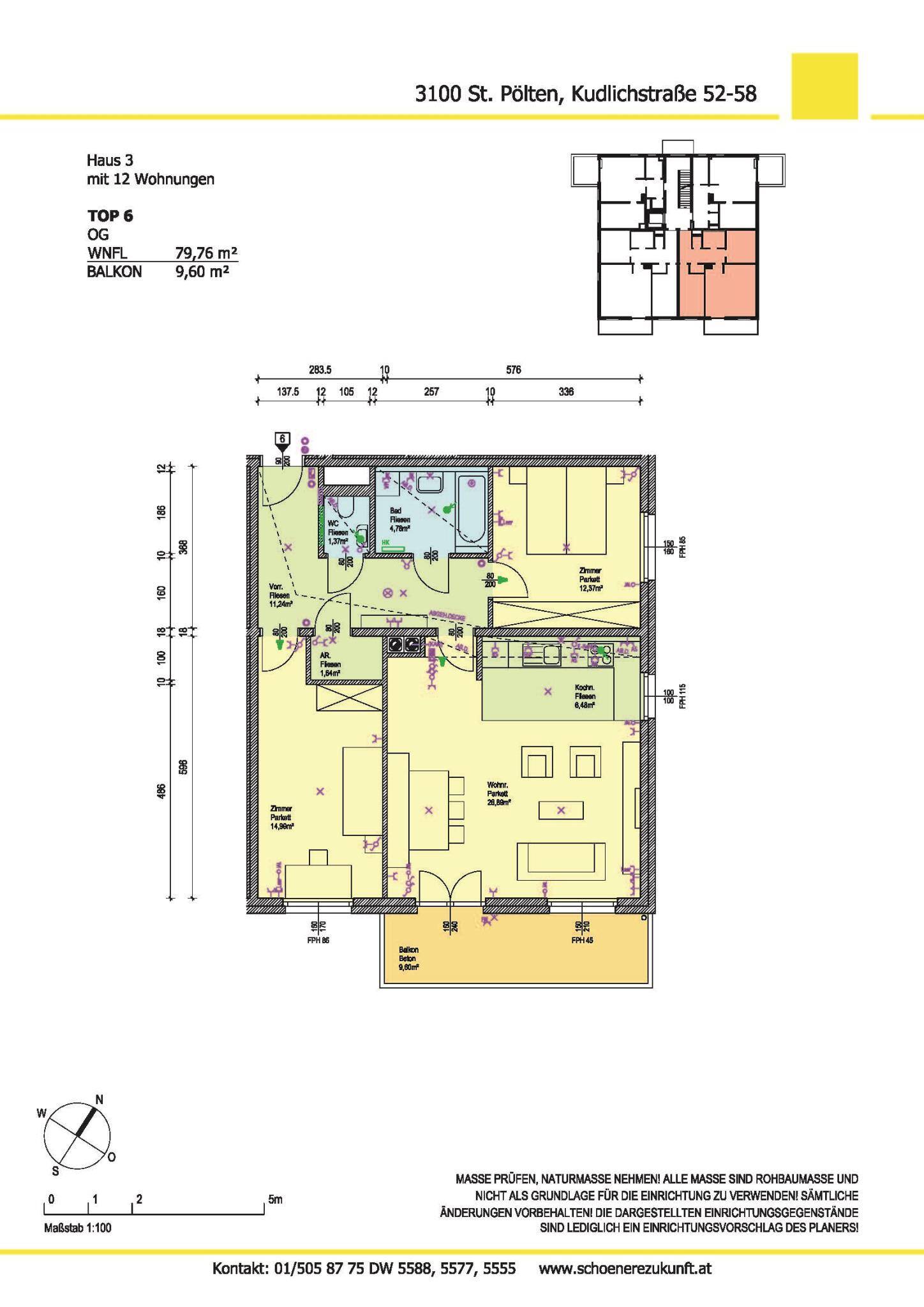 Die 79,76 m² große 3-Zimmerwohnung befindet sich im Obergeschoss, und verfügt über einen süd-ost-seitigen Balkon.Ein Kellerabteil sowie ein Tiefgaragenstellplatz sind der Wohnung zugehörig.