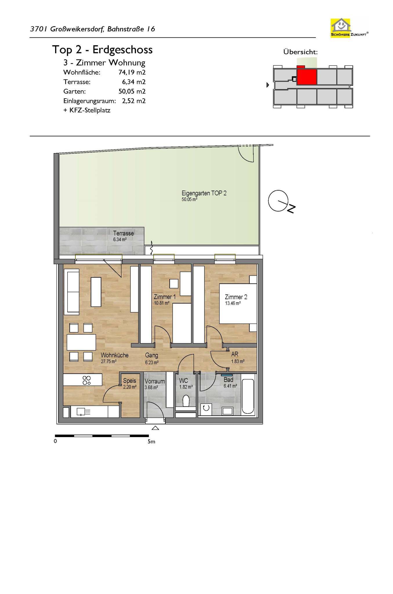 Großweikersdorf, Bahnstraße 16 – Moderne Wohnungen mit durchdachter Ausstattung! Das Projekt in der Bahnstraße 16 umfasst 23 moderne Wohneinheiten in Miete nmit Kaufoption und 36 PKW-Stellplätze. Das Wohnhaus gliedert sich in Erdgeschoss, Obergeschoss und Dachgeschoss. Alle Etagen sind bequem über einen Lift erreichbar. Die Wohnungen bieten Wohnflächen von 50 bis 80 m² und umfassen zwei bis vier Zimmer. Im Ober- und Dachgeschoss verfügen die Einheiten über Freiflächen wie Loggia, Balkon oder Terrasse, während die Erdgeschosswohnungen zusätzlich mit einem Garten ausgestattet sind. Jeder Wohnung ein KFZ-Stellplatz zugeordnet. Praktische Einlagerungsräume sowie Kinderwagen- und Fahrradabstellräume sind zentral im Stiegenhaus untergebracht, um den Bewohnern zusätzlichen Komfort zu bieten. Das Wohnhaus wird durch eine moderne Luft-Wasser-Wärmepumpe beheizt. Alle Wohneinheiten sind mit energieeffizienter Fußbodenheizung ausgestattet. Für ein angenehmes Raumklima sorgt eine kontrollierte Wohnraumlüftung. Änderungen Vorbehalten!