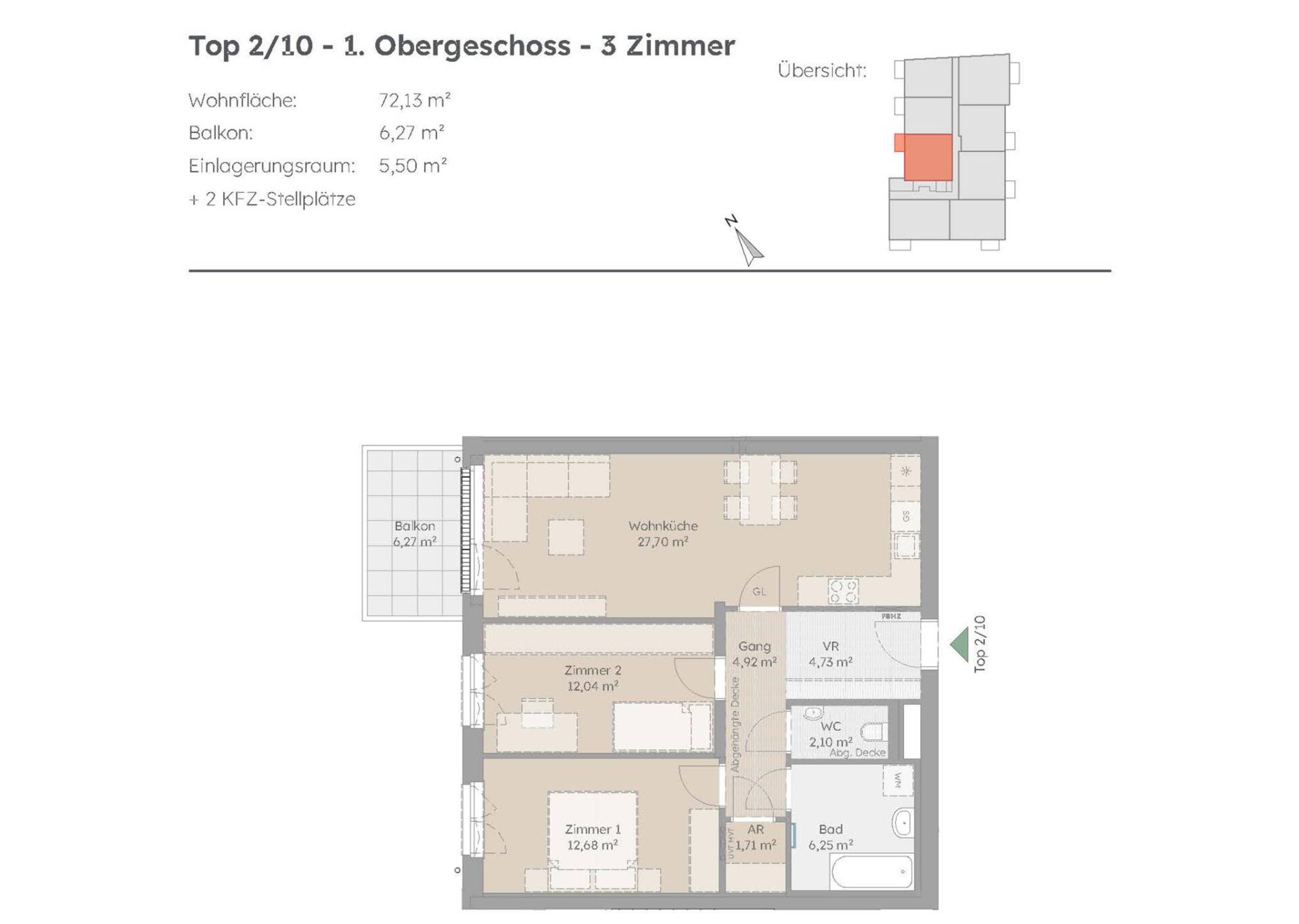Die Wohnung befindet sich im 1. Obergeschoss und ist über einen Lift erreichbar. Sie besteht aus 3 Zimmern auf einer Wohnfläche von 72,13 m² und verfügt über einen 6,27 m² großen, westlich ausgerichteten Balkon. Der Wohnung sind 2 KFZ-Stellplätze sowie ein Einlagerungsraum im Kellergeschoss zugeteilt. Kinderwagen und Fahrradabstellplätze stehen zur Verfügung.