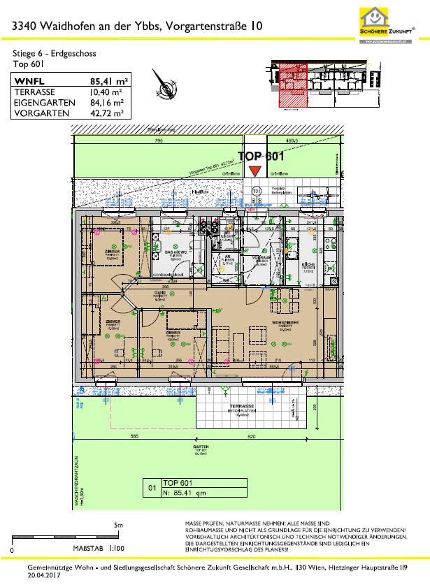 Die Wohnnutzflächen liegen zwischen 77 und 87 m² (3 bzw. 4-Zimmer-Wohnungen).Sämtliche Zugänge und öffentliche Bereiche der Wohnhausanlage werden behindertengerecht gestaltet. Die Stiegen sind vom Kellergeschoss bis zum 2. Obergeschoss über eine behindertengerechte Aufzugsanlage barrierefrei erreichbar. Der Aufzug wurde im Stiegenhaus der Stiege 6 situiert, die Stiege 7 wird über eine Verbindungsbrücke erschlossen.Jeder Wohnung ist eine Terrasse mit Eigengarten im Erdgeschoss oder ein Balkon in den Obergeschossen zugeordnet, sie verfügen ebenso über ein Kellerabteil (Größe ca. 4-6 m²) sowie einen PKW-Abstellplatz in der Tiefgarage. Es besteht die Möglichkeit, einen zweiten PKW-Abstellplatz anzumieten.1 Kinderwagen- und Fahrradabstellraum sowie ein Trockenraum im Kellergeschoss stehen allen Bewohnern zur Verfügung.Im Hofbereich zwischen der Stiege 1 und 5 ist ein Kinderspielplatz angeordnet, Restflächen sind begrünt und mit Sträuchern und Bäumen gärtnerisch gestaltet.Ein überdachter Müllplatz ist an der Arzbergstraße auf Höhe der Stiege 6 situiert.Die südseitigen Eigengärten im Erdgeschoss wurden zum Weg hin mit einem Maschengitterzaun eingefasst, an der Grenze zwischen den einzelnen Eigengärten werden Hecken gepflanzt. Es verfügt jeder Eigengarten über einen Wasseranschluss.
