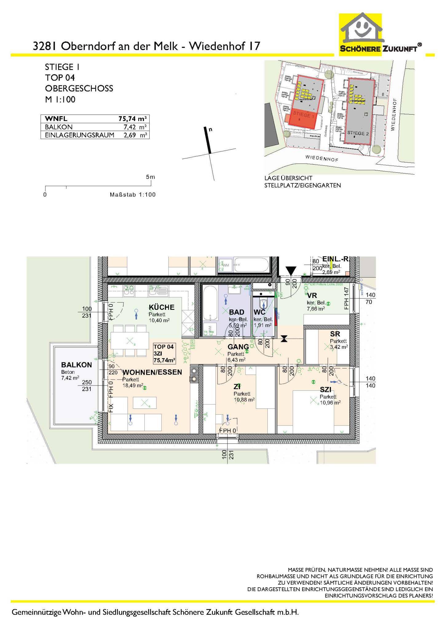 Die Wohnung befindet sich im 1. Obergeschoss der Stiege 1.Sie besteht aus 3 Zimmern bei einer Wohnfläche von 76 m² und verfügt über einen 7 m² großen Balkon.Ein zugehöriger Einlagerungsraum befindet sich im Stiegenhaus.Der Wohnung ist außerdem ein KFZ-Abstellplatz zugeteilt. Ein Kinderwagenabstellraum steht allen Mietern im Stiegenhaus zur Verfügung. Fahrradabstellplätze sind vor der Wohnhausanlage situiert.
