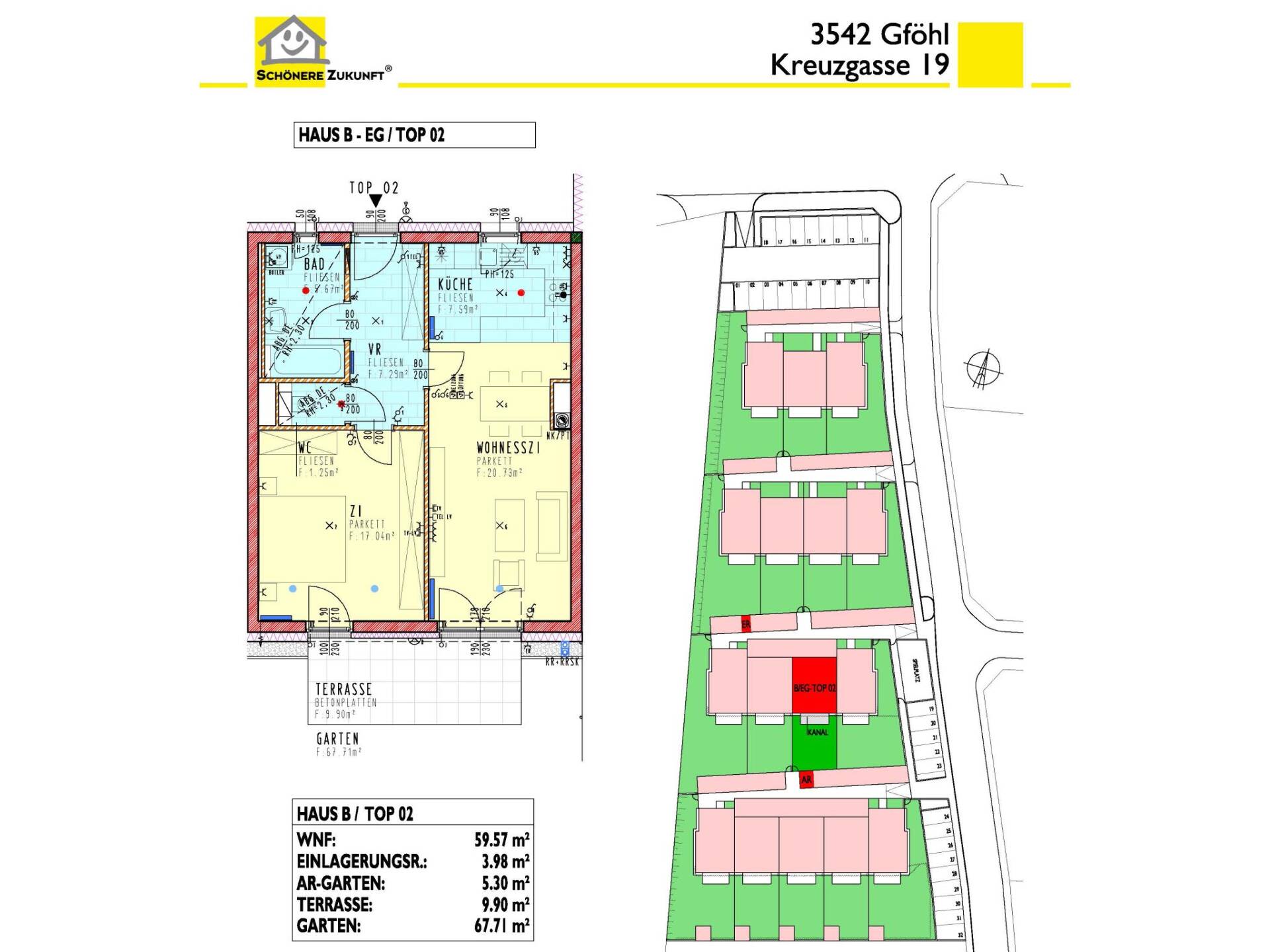 Grundstück/Erschließung: Das längliche, teilweise ebene, teilweise in Richtung Süden leicht abfallende Grundstück liegt in der Kreuzgasse 17-23, 5 Gehminuten vom Stadtzentrum Gföhl entfernt. Die gesamte Anlage wird in zwei Bauabschnitten erstellt und setzt sich aus zwei Wohnhäusern mit insgesamt 10 Wohneinheiten und 4 Reihenhäusern (Haus A und Haus B = Bauabschnitt 2) und aus zwei Reihenhauszeilen (Haus C und Haus D = Bauabschnitt 1) mit insgesamt 7 Reihenhäusern zusammen. Bebauung Bauabschnitt 2: Die Bebauung erfolgt in zwei parallel zueinander liegenden Hauszeilen A und B im südlichen Teil des Grundstücks, wobei Haus A aus zwei Reihenhäusern und sechs Wohnungen, Haus B aus zwei Reihenhäusern und vier Wohnungen besteht. Die Reihenhäuser weisen eine einfache kubische Form kombiniert mit einem Satteldach auf. Die Häuser sind nicht unterkellert. Reihenhäuser: Die Reihenhäuser werden 2-geschoßig (EG+OG) errichtet. Die Ausrichtung der Wohneinheiten erfolgt nach Süden in der Art, dass die Wohn-, Essbereiche über eine vorgelagerte Terrasse mit den Gärten in Verbindung stehen. Die Erschließung in das jeweilige Reihenhaus erfolgt über die dem Fußweg zugeordnete, nordseitige Eingangstüre. Im EG befinden sich ein großer Wohn- bzw. Essraum mit zugeordneter Küche sowie ein Haustechnikraum und ein WC. Im 1.OG befinden sich ein Bad mit WC und drei Schlafzimmer. Die Wohnnutzfläche pro Reihenhaus beträgt ca. 108 m2. Wohnungen: Es werden insgesamt 10 Wohneinheiten auf zwei Geschossen errichtet. Die Ausrichtung der Wohneinheiten erfolgt in der Art, dass die Wohnbereiche im Erdgeschoß südseitig über eine vorgelagerte Terrasse mit den Gärten in Verbindung stehen. In den darüber liegenden Wohnungen sind diesen Bereichen Balkone vorgelagert. Die vertikale Erschließung zur jeweiligen Wohnung erfolgt über ein nordseitiges, witterungsgeschütztes Stiegenhaus und einen offenen Laubengang. Jede Wohnung verfügt über einen großen Wohn- bzw. Essraum mit zugeordneter Küche, Schafzimmer mit direktem Ausgang zur Terrasse bzw. Balkon, ein Bad und WC. Die Wohnnutzfläche pro Wohneinheit beträgt ca. 60 m2. Außenanlagen: Die Erschließung erfolgt an der Nordseite über asphaltierte Fußwege. Zwischen den Fußwegen und den Reihenhäusern befinden sich Vorplätze und kleine Vorgärten zur individuellen Gestaltung. Jedes Reihenhaus und jede Wohneinheit im Erdgeschoss verfügt über einen südseitigen Garten. Die Gärten werden mit einem 1 Meterhohen Maschendrahtzaun eingefriedet. Jedem Reihenhaus, jeder Wohneinheit im Erdgeschoss steht ein in massiver Bauweise errichteter Gartenabstellraum zur Verfügung. Nördlich des Erschließungsfußweges sind langgestreckte, eingeschossige Nebengebäude situiert, in denen sich die Haustechnik-, Müll- sowie zusätzlich jeder Wohneinheit zugewiesene Abstellräume befinden.