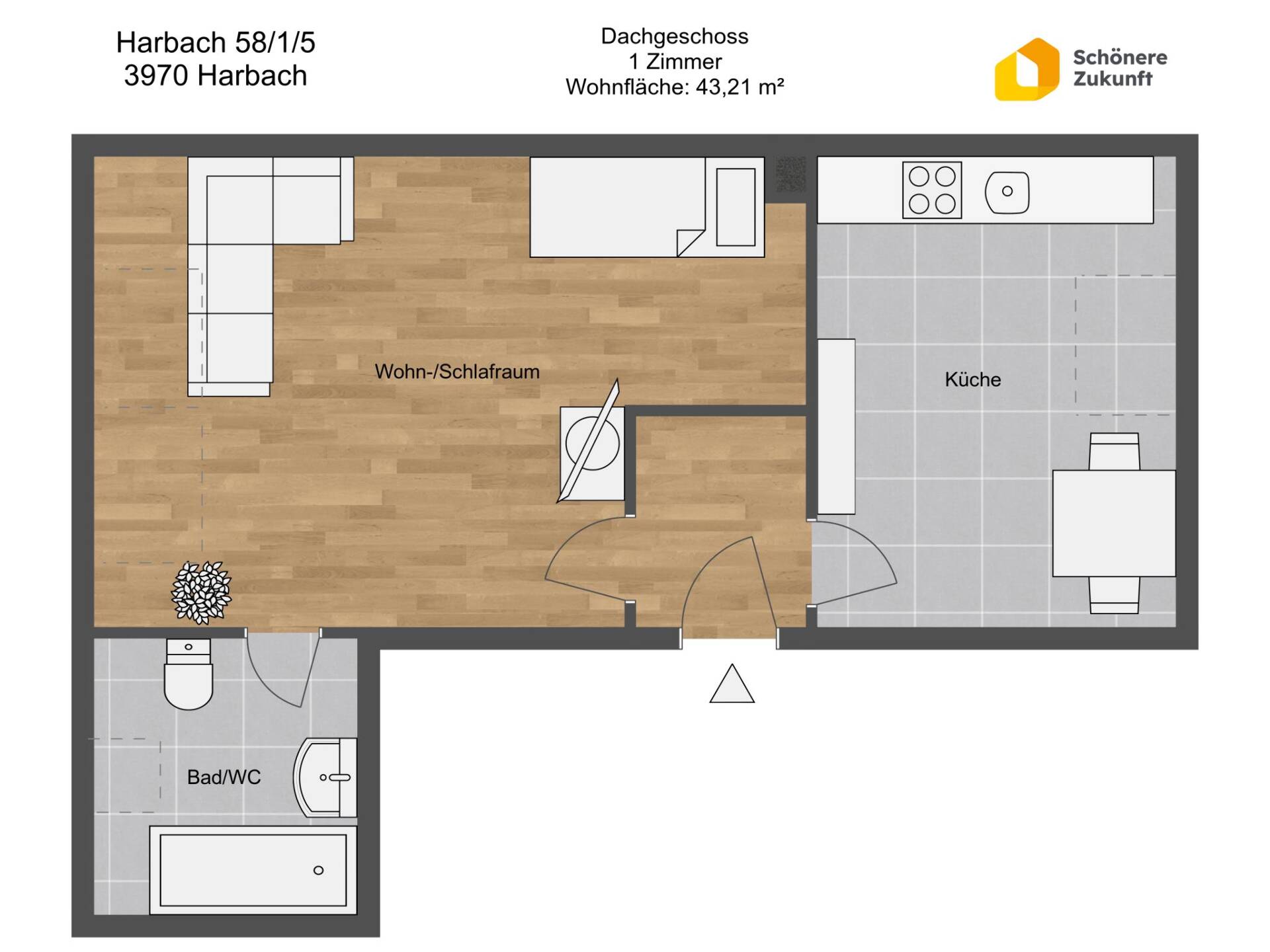 Die 1-Zimmerwohnung befindet sich im Dachgeschoss der Stiege 1 und hat eine Wohnfläche von ca. 43 m². Sie bestehet aus einem zentralen Vorraum, einem Wohn-Schlafzimmer, separater Küche inkl. Küchenmöbel und einem Badezimmer mit Badewanne und WC, mit Fenster.Zusätzlichen Stauraum bietet der zugehörige Kellerabteil.