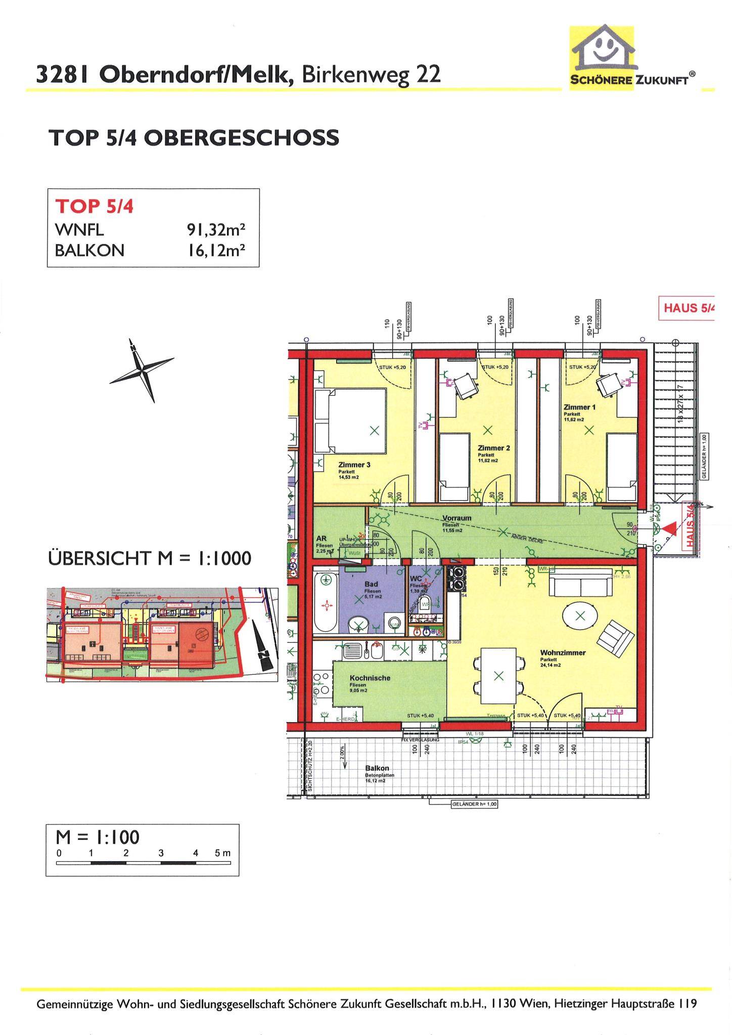 Die 2013 errichteten Wohnanlagen am Birkenweg in Oberndorf/Melk umfassen insgesamt 6 Wohnungen. Die 3-Zimmer-Wohnungen haben eine Fläche von 76 m², während die 4-Zimmer-Wohnungen 91 m² groß sind. Die Wohnungen im Erdgeschoss verfügen jeweils über eine Terrasse und einen Garten, während die Wohnungen im Obergeschoss mit einem großen Balkon ausgestattet sind. Alle Wohnungen befinden sich in einem Erdgeschoss und Obergeschoss, wobei die im Obergeschoss liegenden Wohneinheiten über außenliegende Stiegenanlagen erschlossen werden. Zwischen den Gebäuden befinden sich Nebenräume, die den gemeinschaftlichen Einrichtungen wie Kinderwagenabstellräumen, einem Trockenraum und den Kellerabteilen für die Obergeschoss-Wohnungen dienen. Zudem ist jeder Wohnung ein KFZ-Stellplatz zugeteilt.