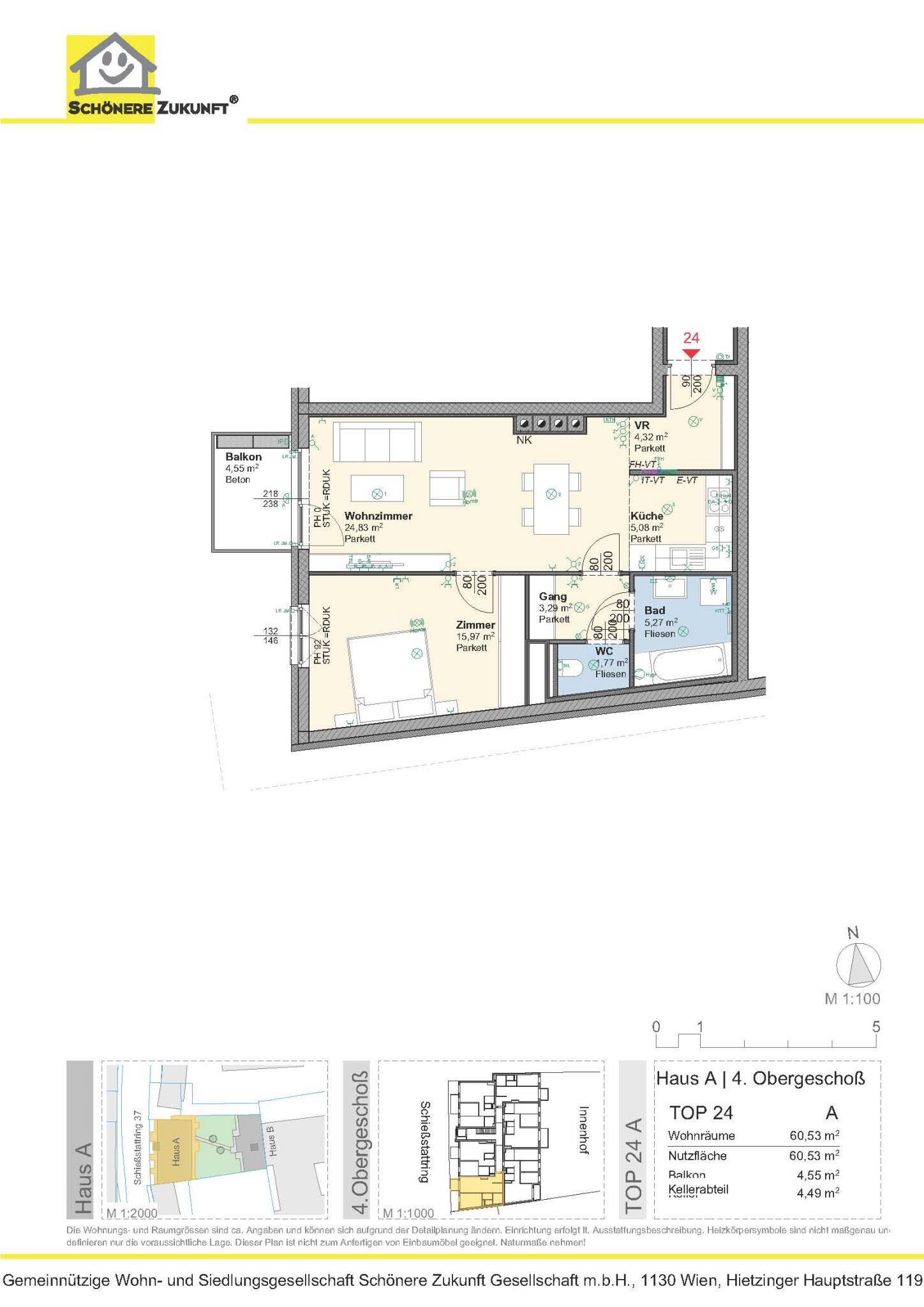 Die Wohnung befindet sich im 4. Obergeschoss der Stiege A und besteht aus 2 Zimmern auf einer Wohnfläche von 60,53m².Sie verfügt über einen westlich ausgerichteten Balkon mit einer Größe von 4,55m².Jeder Wohnung ist ein Einlagerungsraum im Kellergeschoss, sowie ein Tiefgaragenstellplatz zugeteilt.Ein Kinderwagen/Fahrradabstellraum, ein Spielraum und ein Kinderspielplatz im Innenhof stehen allen Mietern zur freien Verfügung.