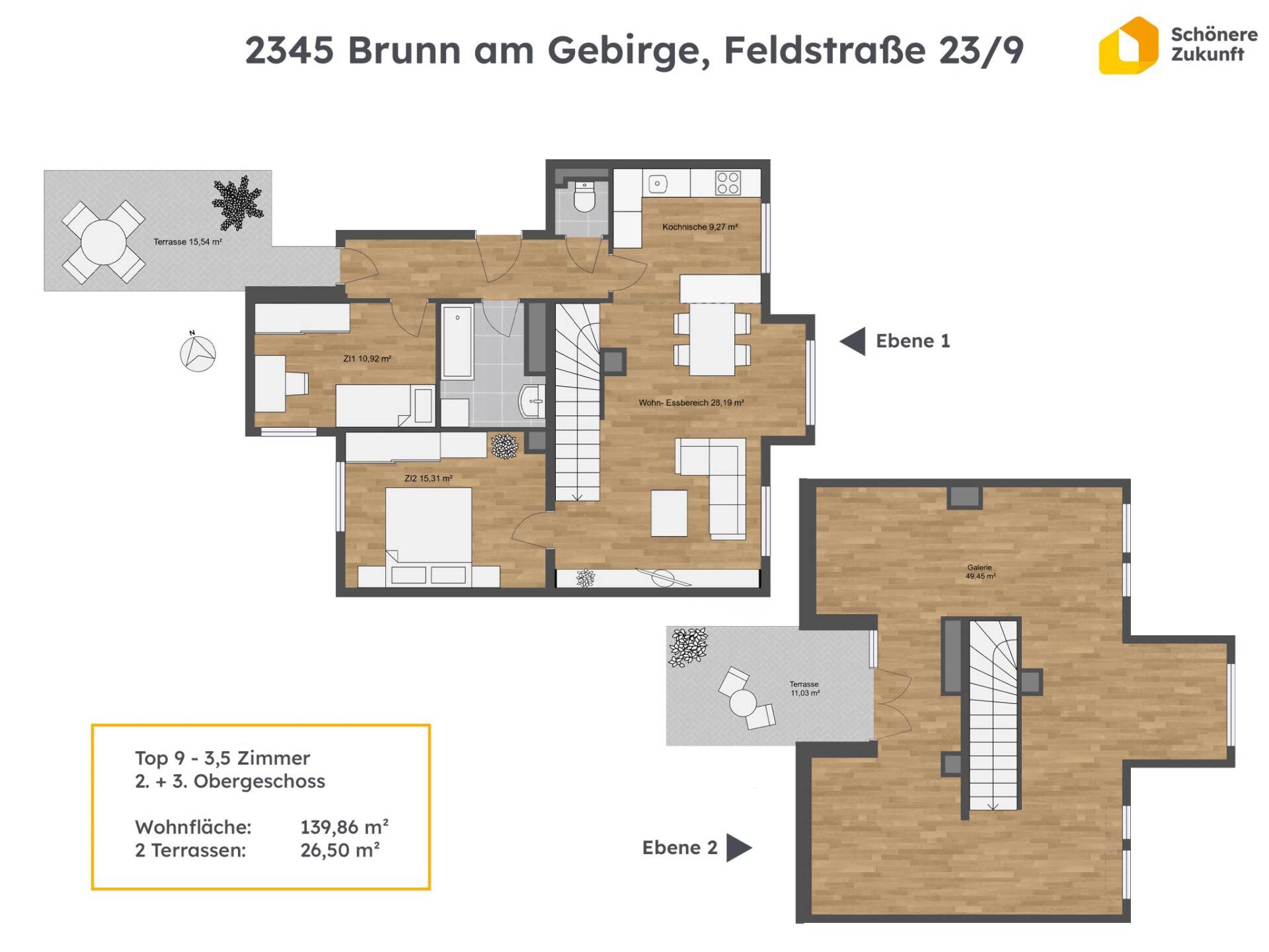 Bei der Wohnung Top 9 handelt es sich um eine Maisonettewohnung, die sich vom 2. Obergeschoss bis ins Dachgeschoss erstreckt. Sie besteht aus 3 Zimmern und einer großen Galerie. Auf der ersten Ebene befinden sich 2 Zimmer, der offene Wohnbereich mit Küche, ein Badezimmer mit Badewanne, ein separates WC und eine 15 m² große Terrasse. Die zweite Ebene der Wohnung ist eine vielseitig nutzbare Galerie mit einer Fläche von 58 m² und dem Zugang zur zweiten Terrasse. Ein Einlagerungsraum im Erdgeschoss ist der Wohnung zugeteilt, außerdem steht ein Garten zur gemeinschaftlichen Nutzung zur Verfügung. Bei Bedarf können im Erdgeschoss befindliche KFZ-Stellplätze (komplett überdacht oder teilweise überdacht) zu der Wohnung angemietet werden.