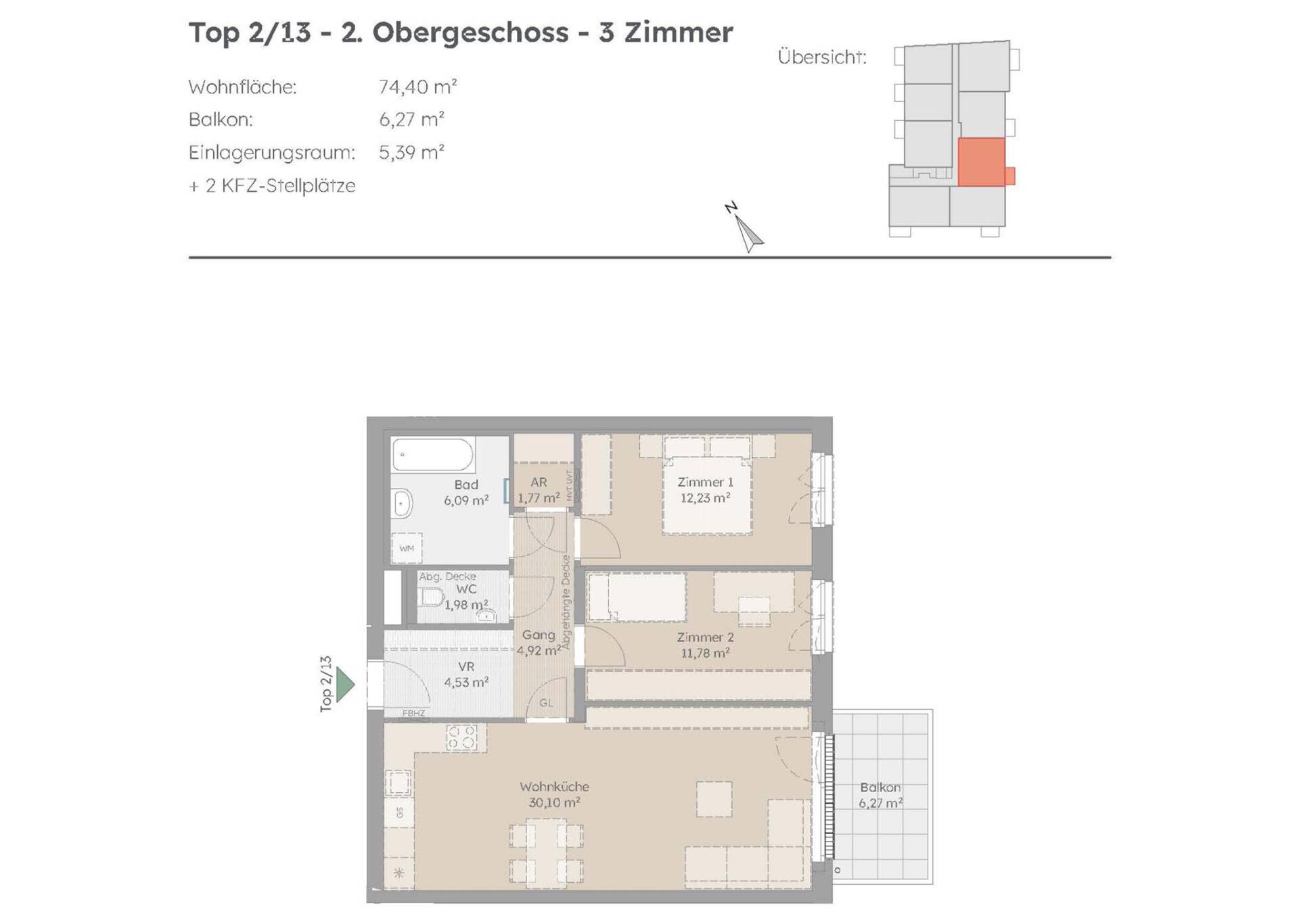 Die Wohnung befindet sich im 2. Obergeschoss und ist über einen Lift erreichbar. Sie besteht aus 3 Zimmern auf einer Wohnfläche von 74,40 m² und verfügt über einen 6,27 m² großen, ötlich ausgerichteten Balkon. Der Wohnung sind 2 KFZ-Stellplätze sowie ein Einlagerungsraum im Kellergeschoss zugeteilt. Kinderwagen und Fahrradabstellplätze stehen zur Verfügung.