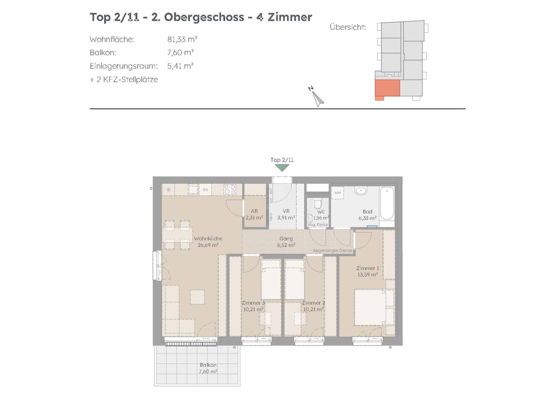 Die Wohnung befindet sich im 2. Obergeschoss und ist über einen Lift erreichbar. Sie besteht aus 4 Zimmern auf einer Wohnfläche von 81,33 m² und verfügt über eine 7,60 m² großen, südwestlich ausgerichteten Balkon. Der Wohnung sind 2 KFZ-Stellplätze sowie ein Einlagerungsraum im Kellergeschoss zugeteilt. Kinderwagen und Fahrradabstellplätze stehen zur Verfügung.