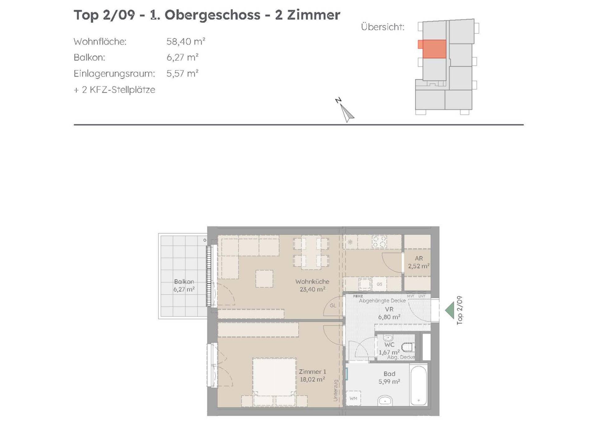 Die Wohnung befindet sich im 1. Obergeschoss und ist über einen Lift erreichbar. Sie besteht aus 2 Zimmern auf einer Wohnfläche von 58,40 m² und verfügt über einen 6,27 m² großen, westlich ausgerichteten Balkon. Der Wohnung sind 2 KFZ-Stellplätze sowie ein Einlagerungsraum im Kellergeschoss zugeteilt. Kinderwagen und Fahrradabstellplätze stehen zur Verfügung.