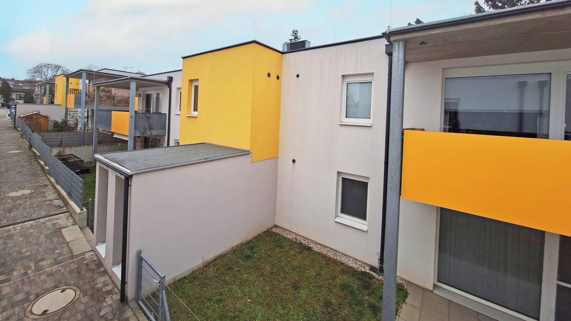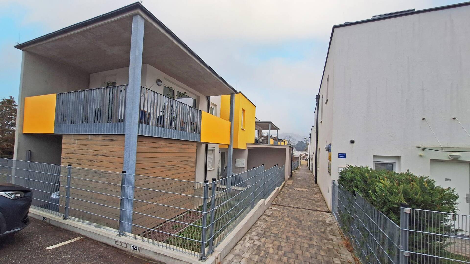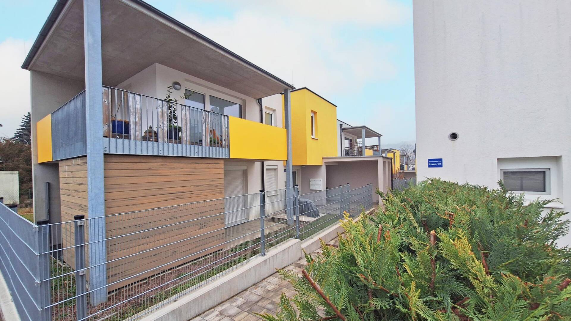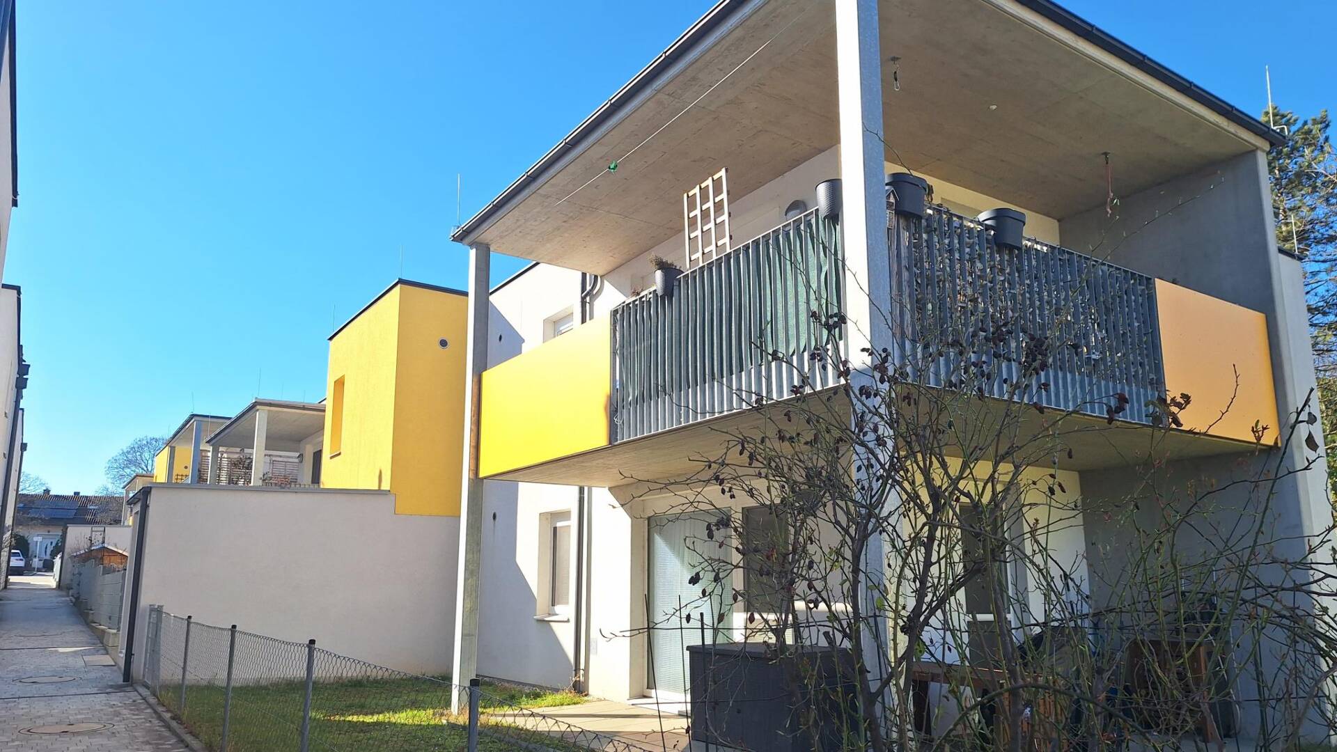 Das Projekt umfasst zwei Wohnhäuser mit jeweils vier Wohneinheiten sowie drei Doppelhäuser mit jeweils zwei Wohneinheiten und bietet insgesamt 14 Wohneinheiten. Die Gebäude bestehen aus einem Erdgeschoss und einem 1. Obergeschoss und sind nicht unterkellert. Jeder Wohnung ist ein eigener Einlagerungsraum im Stiegenhaus zugeordnet. Pro Wohnung steht ein KFZ-Stellplatz im Freien zur Verfügung, pro Doppelhaushälfte sind es zwei. Zusätzlich gibt es gemeinschaftlich nutzbare Abstellflächen für Kinderwägen und Fahrräder. Die Beheizung erfolgt über eine effiziente Luft-Wasser-Wärmepumpe mit Wärmeabgabe über eine Fußbodenheizung. Eine kontrollierte Wohnraumlüftung sowie eine Photovoltaikanlage ergänzen das nachhaltige Energiekonzept. Die Erdgeschosswohnungen und Doppelhaushälften verfügen über private Gärten und Terrassen, während die oberen Wohnungen mit Balkonen ausgestattet sind.