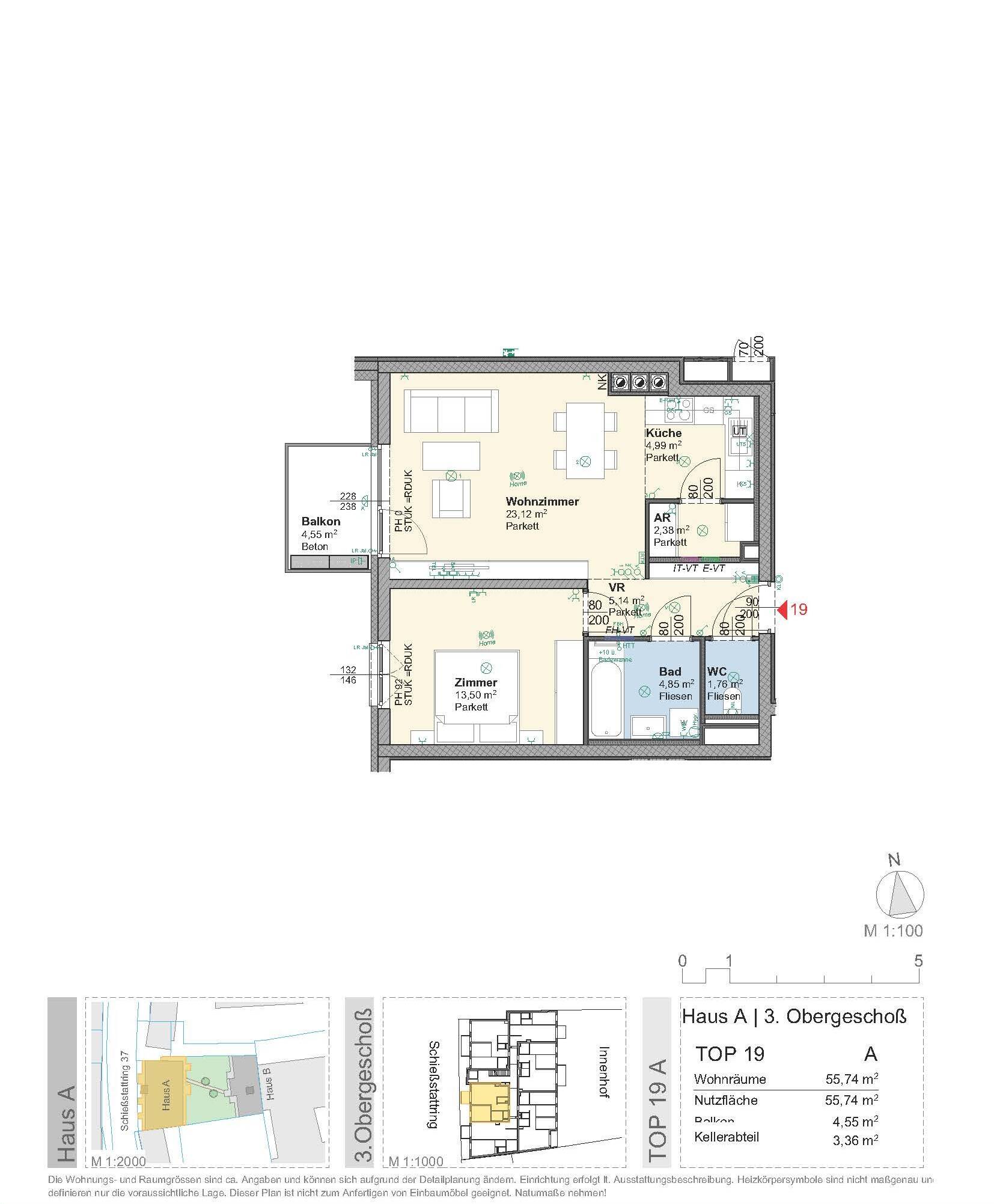Auf dem Grundstück in der Zentrumszone von St. Pölten wurde eine Wohnhausanlage bestehend aus zwei Wohngebäuden (Haus A und Haus B) mit insgesamt 48 Wohnungen errichtet. Die zwei Wohngebäude bestehen aus insgesamt 6 Geschossen. Jede Wohnung im Haus A hat einen Balkon bzw. eine Loggia in östlicher bzw. westlicher Richtung. Die Wohnungen im Haus B besitzen Balkone in westlicher Richtung. Dachgeschoß-Wohnungen umfassen Terrassen und Balkone. Unter dem gesamten Grundstück wurde eine zweigeschossige Tiefgarage für insgesamt 70 PKW-Stellplätze errichtet. In jedem Geschoss befinden sich ein barrierefreier Parkplatz und einer für Familien.Sämtliche Abstellräume für die Mieter befinden sich in den Kellergeschossen.