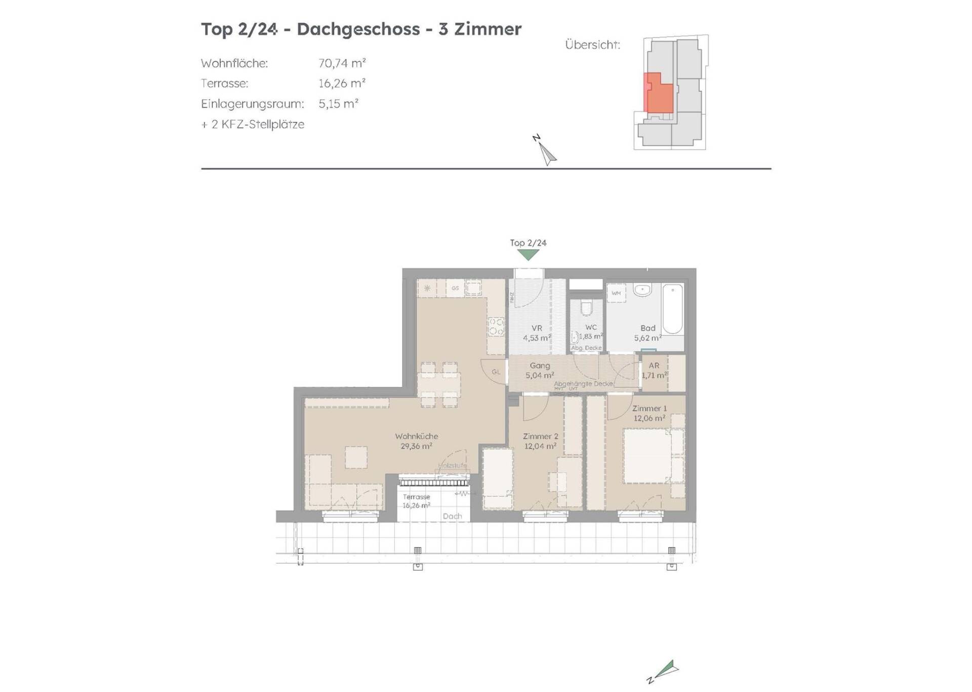 Die Wohnung befindet sich im Dachgeschoss und ist über einen Lift erreichbar. Sie besteht aus 3 Zimmern auf einer Wohnfläche von 70,74 m² und verfügt über eine 16,26 m² große, westlich ausgerichtete Terrasse. Der Wohnung sind 2 KFZ-Stellplätze sowie ein Einlagerungsraum im Kellergeschoss zugeteilt. Kinderwagen und Fahrradabstellplätze stehen zur Verfügung.