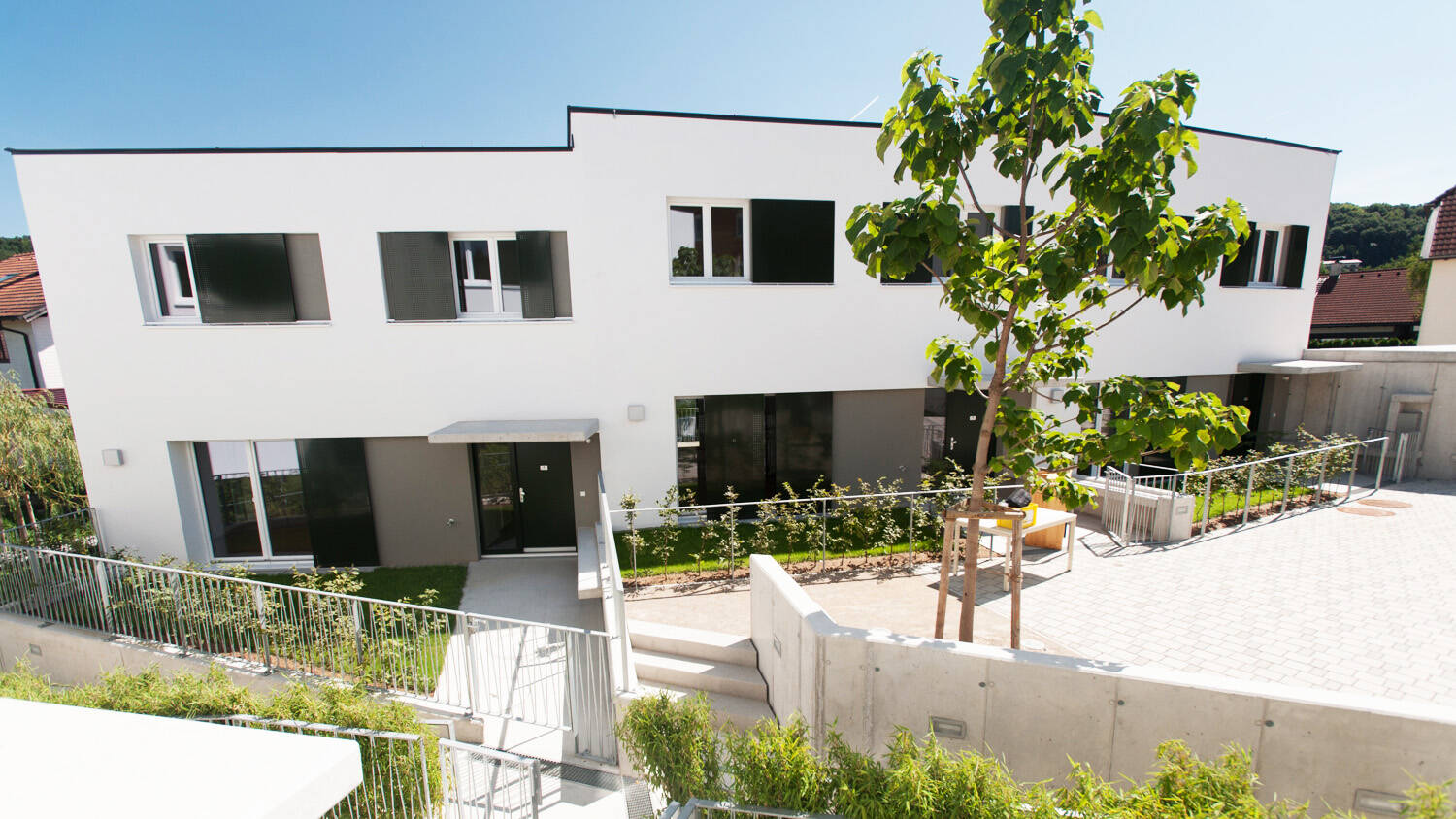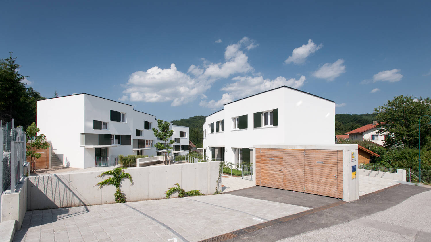 Errichtet wurden 7 Reihenhäuser, 4 davon werden mit 3 Zimmern sowie einem Souterrainzimmer zwischen 97 und 99m² groß und 3 mit 4 Zimmern in der Größe von ca. 93m² angeboten. Alle Häuser haben eine Terrasse sowie einen Eigengarten. Die Häuser der 4er Reihe haben zusätzlich ein Atrium als Freiraum. Pro Wohneinheit werden 2 KFZ-Abstellplätze am Parkplatz zugeordnet. Die Kellerabteile befinden sich in den jeweiligen Kellern der einzelnen Häuser. Im Außenbereich befindensich ein Fahrradabstellraum sowie der Müllplatz. Die Konfiguration der Außenanlagen sowie Eigengärten erfolgt entsprechend dem Lageplan.