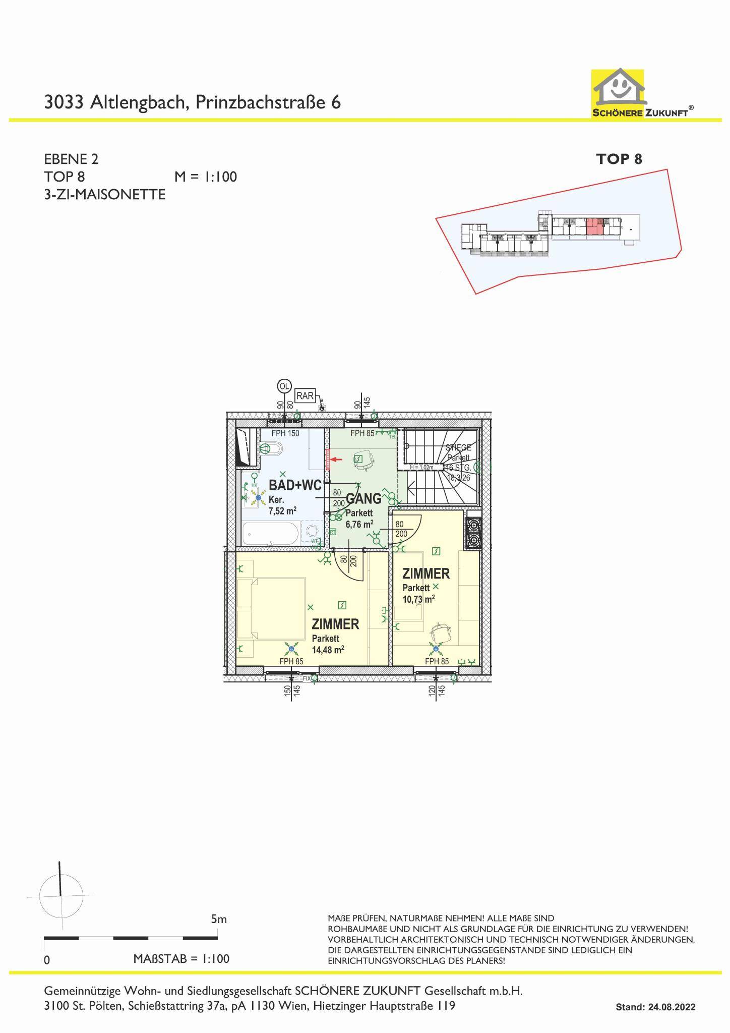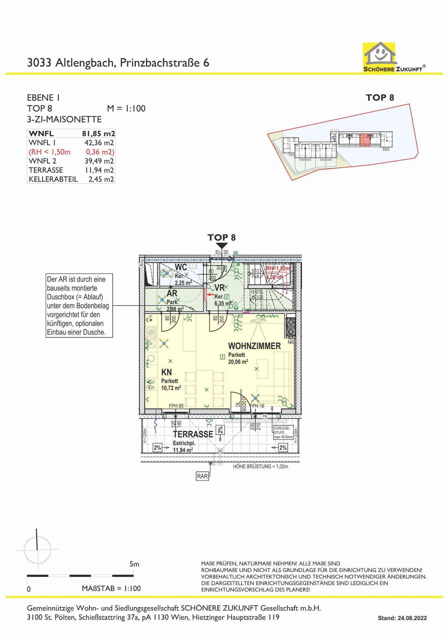 Die Wohnung ist eine Maisonettewohnung und befindet sich im 1./2. Obergeschoss. Sie besteht aus 3 Zimmern bei einer Wohnfläche von 81,85 m² und verfügt über eine 11,94 m² große Terrasse. Der Wohnung sind ein Kellerabteil im Erdgeschoss, sowie 2 Garagenstellplätze zugeteilt. Ein Kinderwagenabstellraum und mehrere Fahrradabstellplätze im Erdgeschoss stehen allen Mietern zur Verfügung.