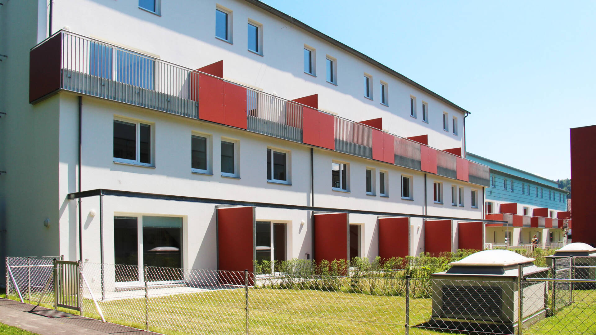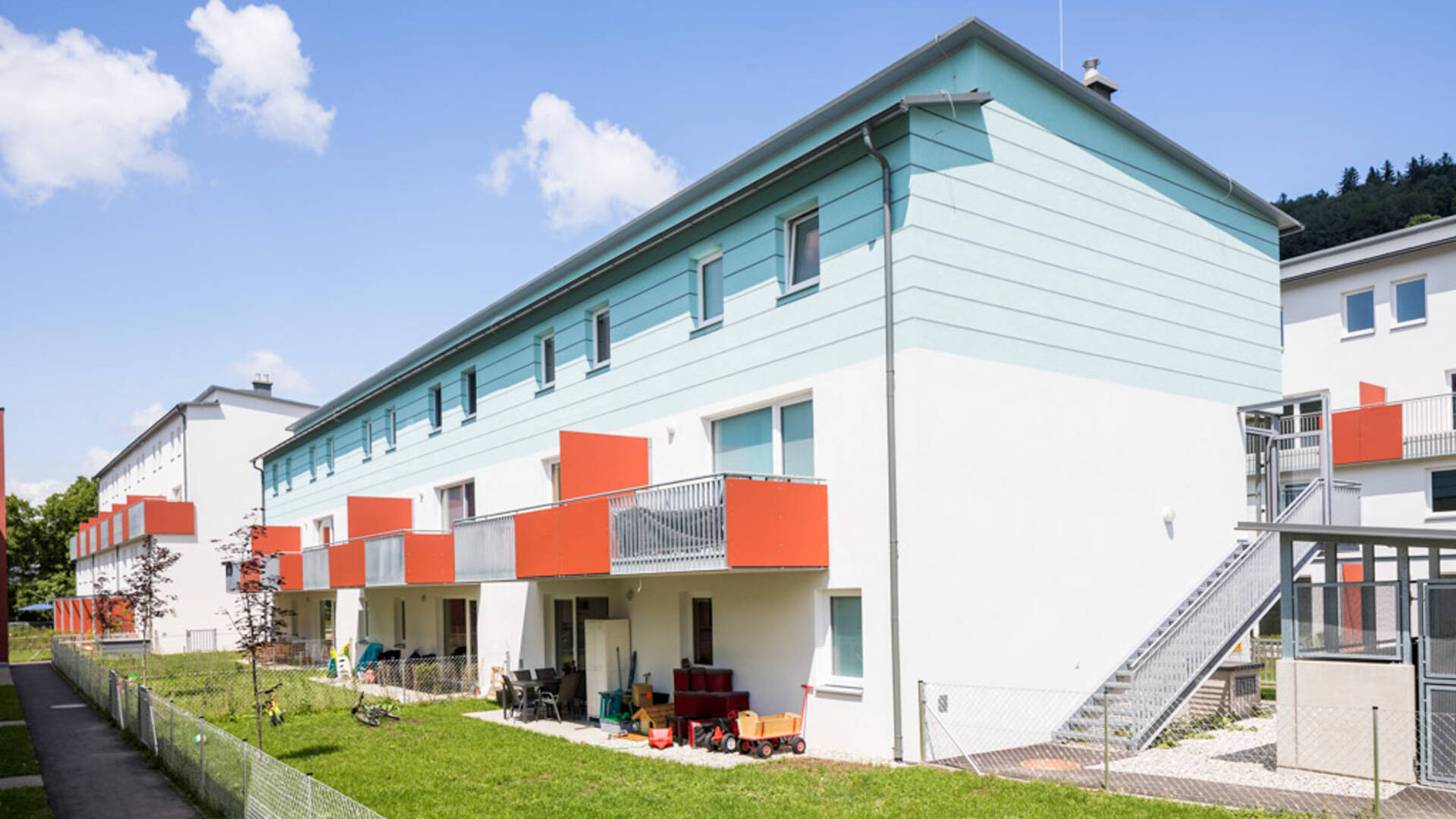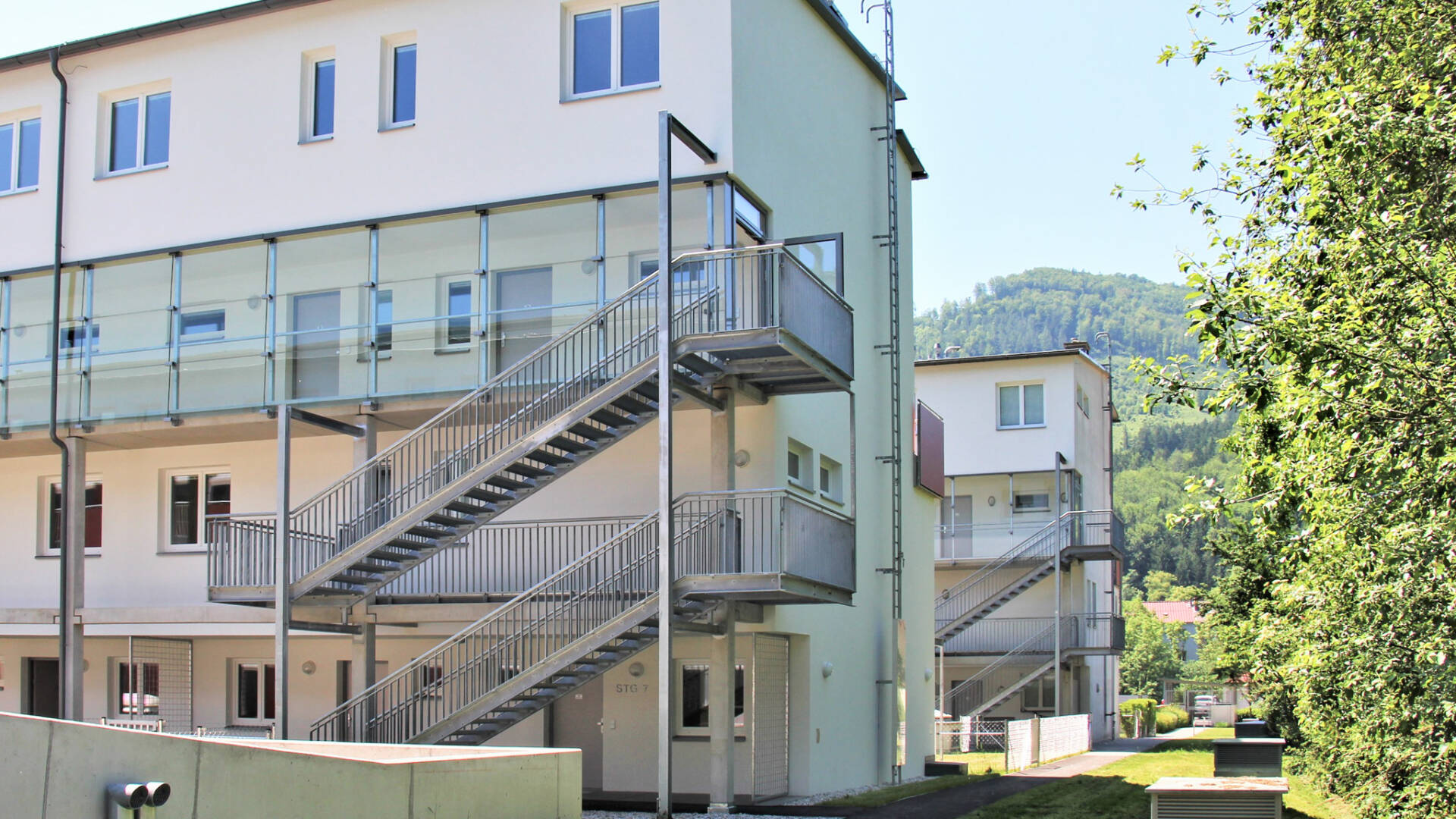 Die Wohnnutzflächen liegen zwischen 77 und 87 m² (3 bzw. 4-Zimmer-Wohnungen).Sämtliche Zugänge und öffentliche Bereiche der Wohnhausanlage werden behindertengerecht gestaltet. Die Stiegen sind vom Kellergeschoss bis zum 2. Obergeschoss über eine behindertengerechte Aufzugsanlage barrierefrei erreichbar. Der  Aufzug wurde im Stiegenhaus der Stiege 6 situiert, die Stiege 7 wird über eine Verbindungsbrücke erschlossen.Jeder Wohnung ist eine Terrasse mit Eigengarten im Erdgeschoss oder ein Balkon in den Obergeschossen zugeordnet,  sie verfügen ebenso über ein Kellerabteil (Größe ca. 4-6 m²) sowie einen PKW-Abstellplatz in der Tiefgarage. Es besteht die Möglichkeit, einen zweiten PKW-Abstellplatz anzumieten.1 Kinderwagen- und Fahrradabstellraum sowie ein Trockenraum im Kellergeschoss stehen allen Bewohnern zur Verfügung.Im Hofbereich zwischen der Stiege 1 und 5 ist ein Kinderspielplatz angeordnet, Restflächen sind begrünt und mit Sträuchern und Bäumen gärtnerisch gestaltet.Ein überdachter Müllplatz ist an der Arzbergstraße auf Höhe der Stiege 6 situiert.Die südseitigen Eigengärten im Erdgeschoss wurden zum Weg hin mit einem Maschengitterzaun eingefasst, an der Grenze zwischen den einzelnen Eigengärten werden Hecken gepflanzt. Es verfügt jeder Eigengarten über einen Wasseranschluss.