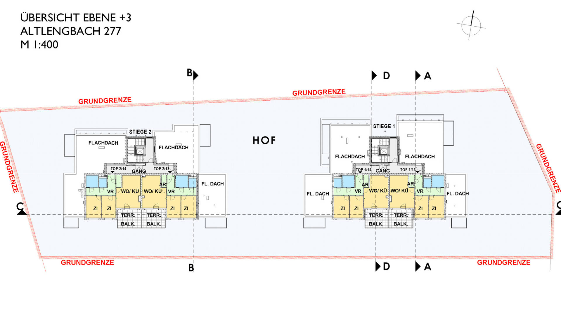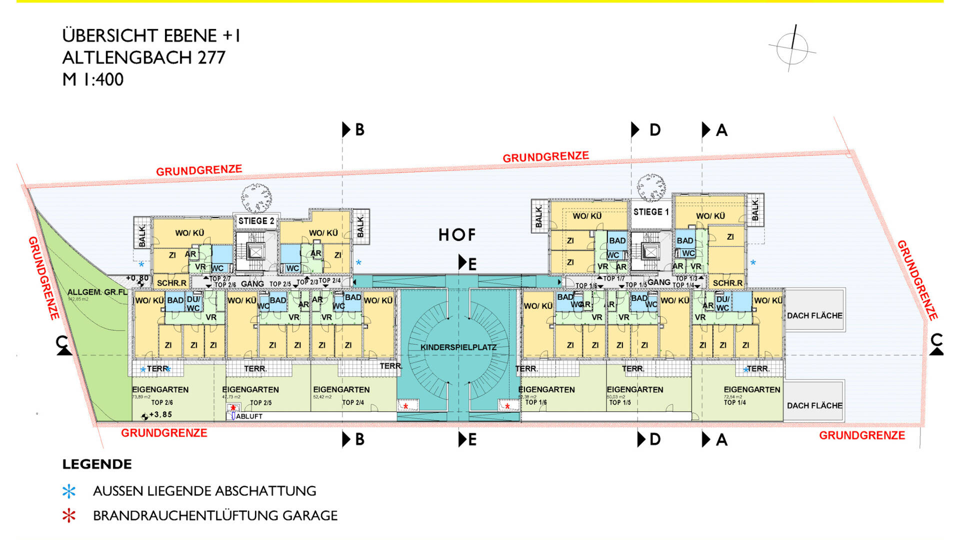 Der überwiegende Teil der Wohnungen ist nach Süden ausgerichtet. Sämtliche Wohnungen punkten mit attraktiven, ausreichend tiefen Freiflächen in Form von Gartenterrassen mit Eigengärten, Balkonen oder Dachterrassen. Die Ausgänge von den Wohnzimmern auf die Gartenterrassen und Balkone werden Barrierefrei gehalten.Alle Wohnungen erhalten eine WohnraumlüftungDie Kinderwagenräume liegen im Nahbereich der Lifte und unter den beiden Vordächern im Eingangsbereich gibt es zusätzliche Fahrradabstellplätze.Der Zentrale Kinderspielplatz auf der Ebene +1 ist optimal von der Prinzbachstraße entfernt und von beiden Stiegen gleich erreichbar.Stiegenhäuser und Gänge sind übersichtlich und einladend angelegt.