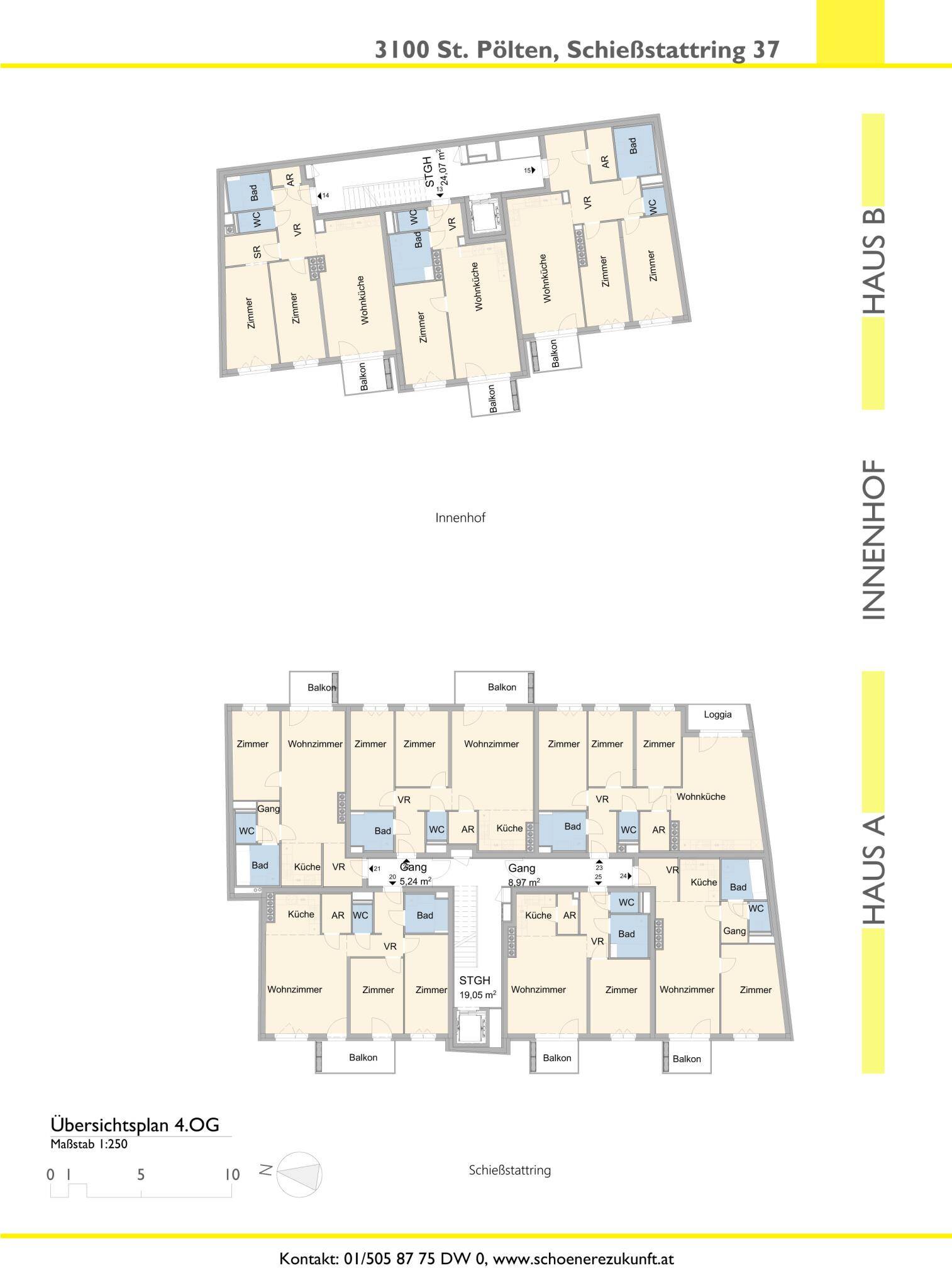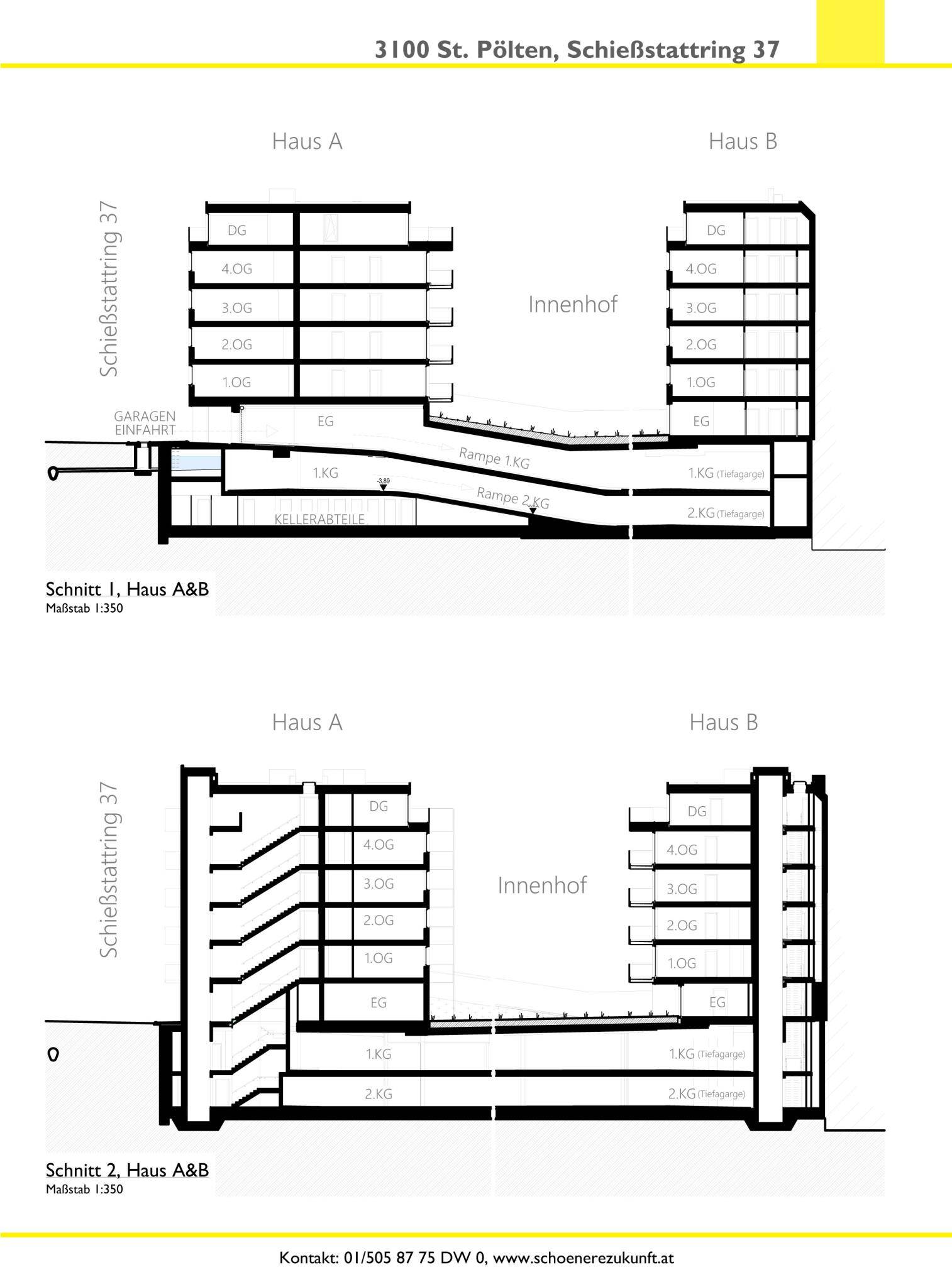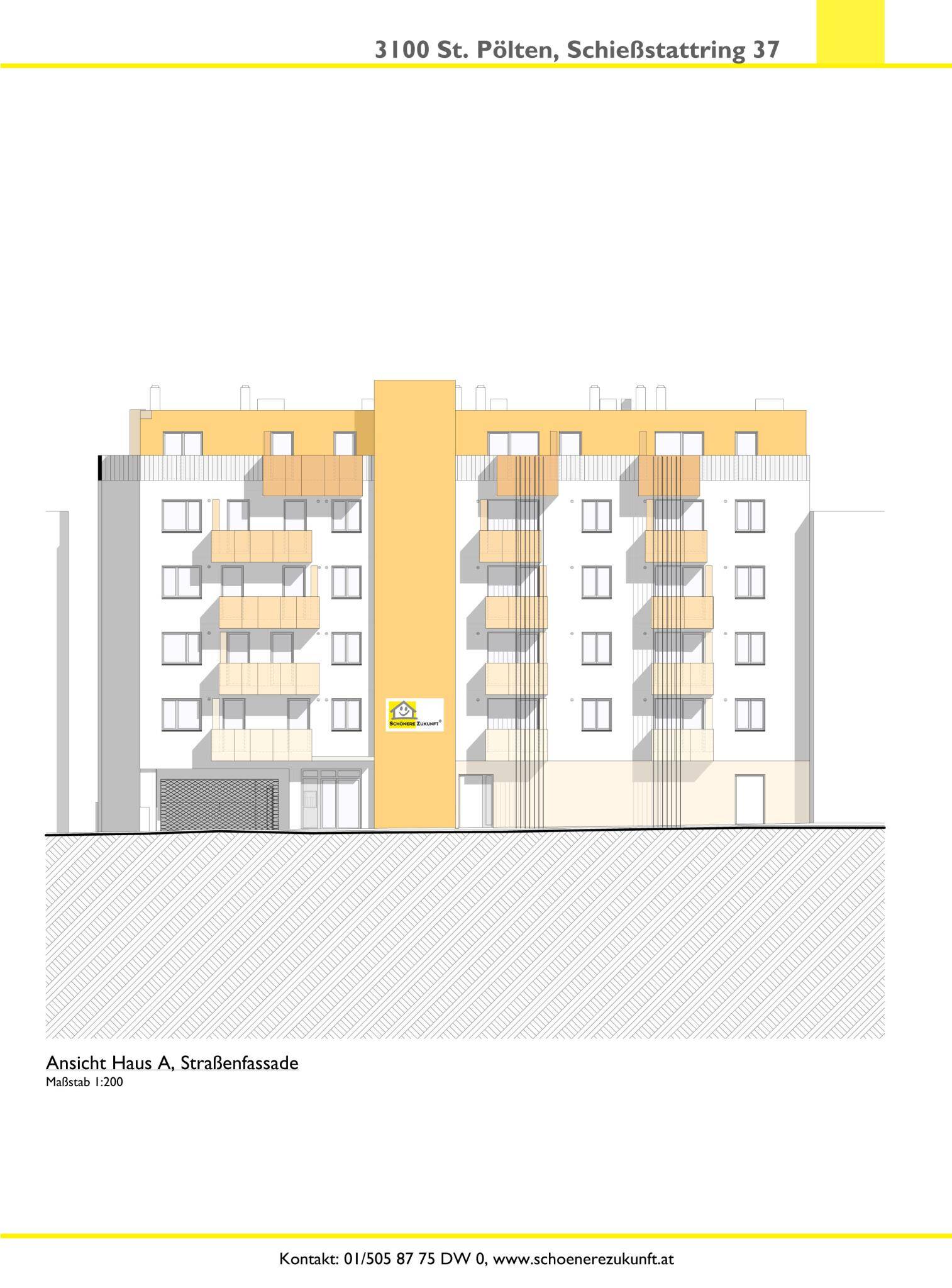 Auf dem Grundstück in der Zentrumszone von St. Pölten wurde eine Wohnhausanlage bestehend aus zwei Wohngebäuden (Haus A und Haus B) mit insgesamt 48 Wohnungen errichtet. Die zwei Wohngebäude bestehen aus insgesamt 6 Geschossen. Jede Wohnung im Haus A hat einen Balkon bzw. eine Loggia in östlicher bzw. westlicher Richtung. Die Wohnungen im Haus B besitzen Balkone in westlicher Richtung. Dachgeschoß-Wohnungen umfassen Terrassen und Balkone. Unter dem gesamten Grundstück wurde eine zweigeschossige Tiefgarage für insgesamt 70 PKW-Stellplätze errichtet. In jedem Geschoss befinden sich ein barrierefreier Parkplatz und einer für Familien.Sämtliche Abstellräume für die Mieter befinden sich in den Kellergeschossen.