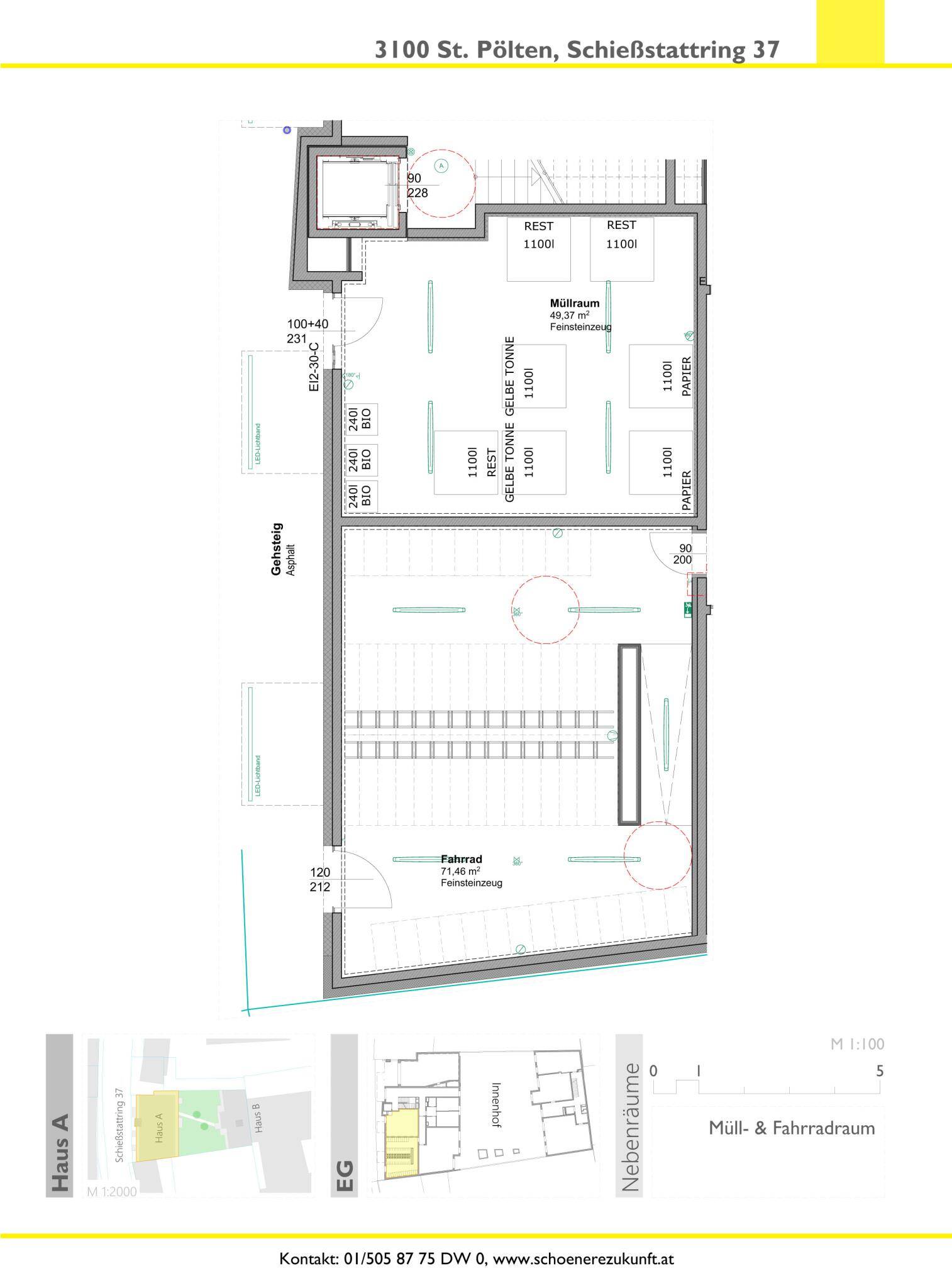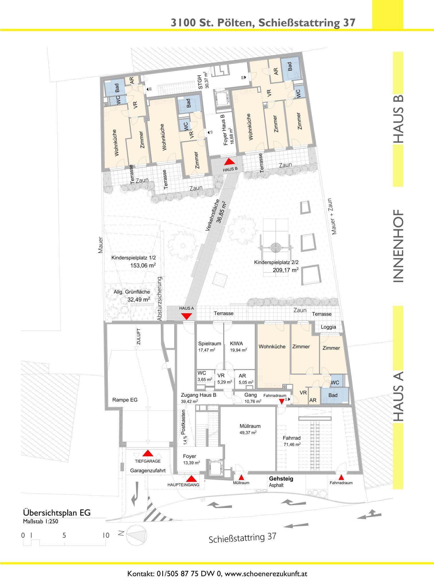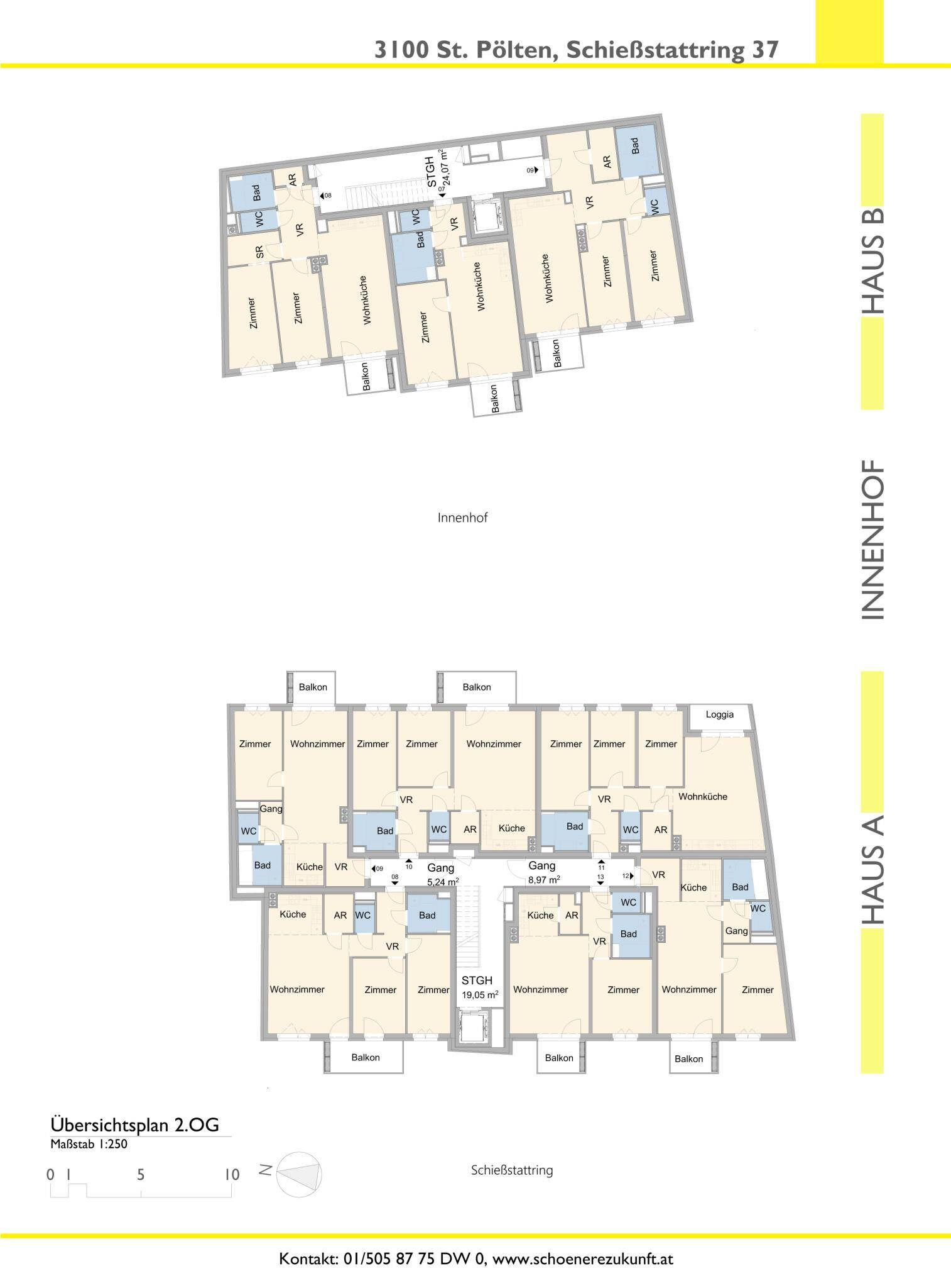 Auf dem Grundstück in der Zentrumszone von St. Pölten wurde eine Wohnhausanlage bestehend aus zwei Wohngebäuden (Haus A und Haus B) mit insgesamt 48 Wohnungen errichtet. Die zwei Wohngebäude bestehen aus insgesamt 6 Geschossen. Jede Wohnung im Haus A hat einen Balkon bzw. eine Loggia in östlicher bzw. westlicher Richtung. Die Wohnungen im Haus B besitzen Balkone in westlicher Richtung. Dachgeschoß-Wohnungen umfassen Terrassen und Balkone. Unter dem gesamten Grundstück wurde eine zweigeschossige Tiefgarage für insgesamt 70 PKW-Stellplätze errichtet. In jedem Geschoss befinden sich ein barrierefreier Parkplatz und einer für Familien.Sämtliche Abstellräume für die Mieter befinden sich in den Kellergeschossen.